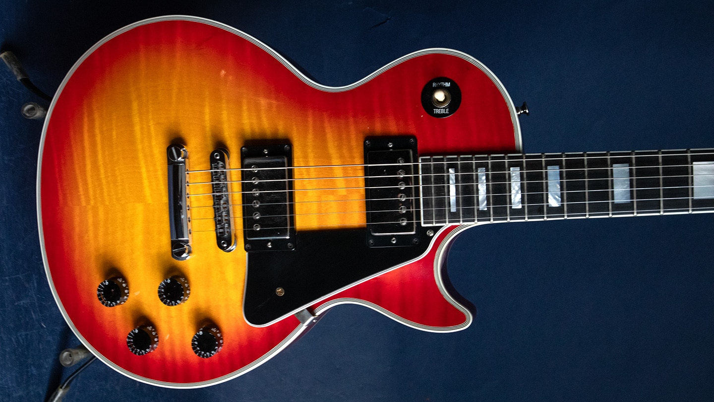Cherry Sunburst with a beautiful flame maple top. This was converted to nickel parts and has a set of Seymour Duncan Slash pickups. Also has a repaired headstock. These are ... $2,350.00