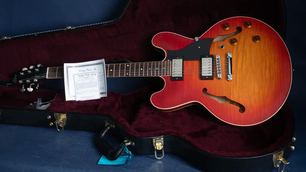 Heritage Cherry, mint unsold condition, mahogany body, bound rosewood fretboard with crown inlays, Gibson 60’s Burstbucker pickups, two volume and two tone controls, mint used model, just in on trade, ... $1,650.00