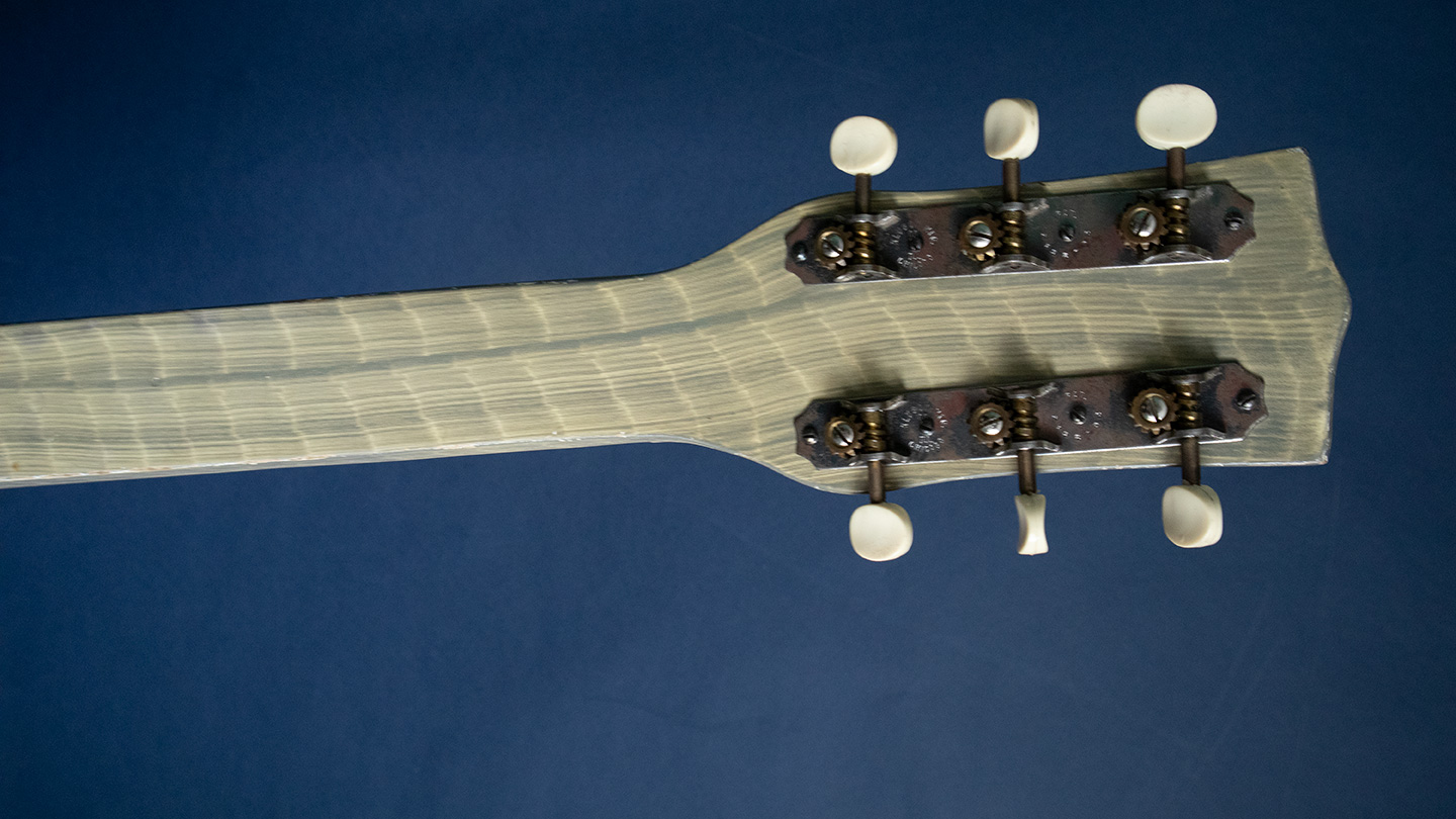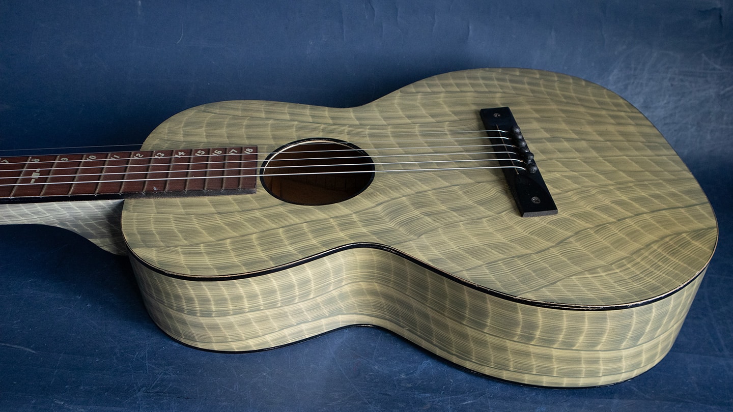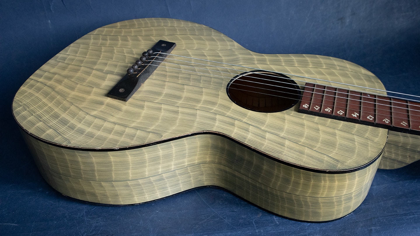 Faux Bamboo finish, square neck Hawaiian acoustic guitar. The opening of the Panama Canal created a Panama California Exposition in 1915-16 to encourage Hawaiian travel Hawaiian music simply enchanted visitors in San Diego. The first uke craze started there and many manufacturers made Hawaiian guitars. Regal made high quality affordable guitar so the American public could try slack key guitar playing. The finish is called Faux Bamboo to look the part. This one sounds great has fresh strings, no cracks or issues. It has changed tuners but the originals are included in the original soft shell case.