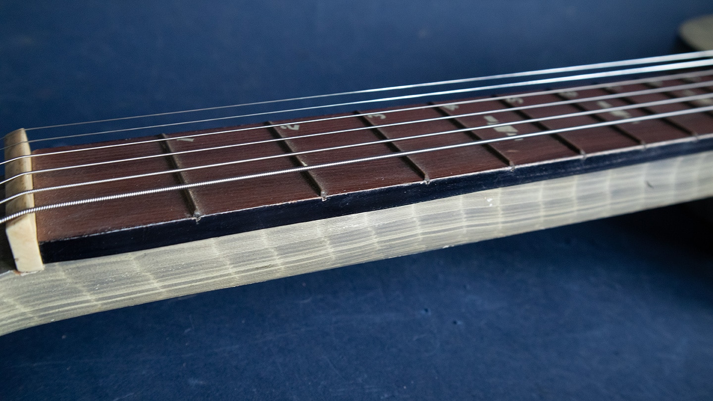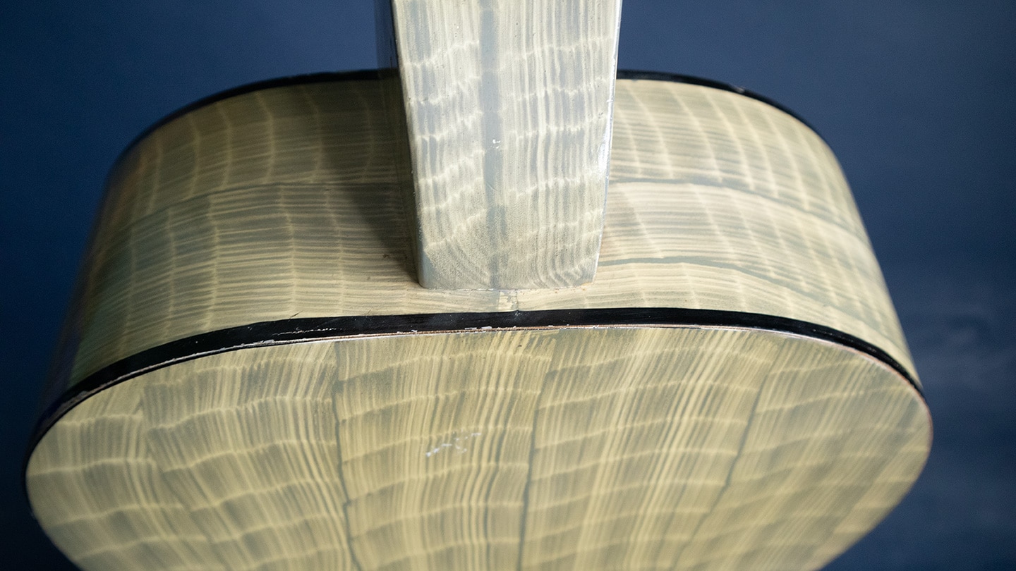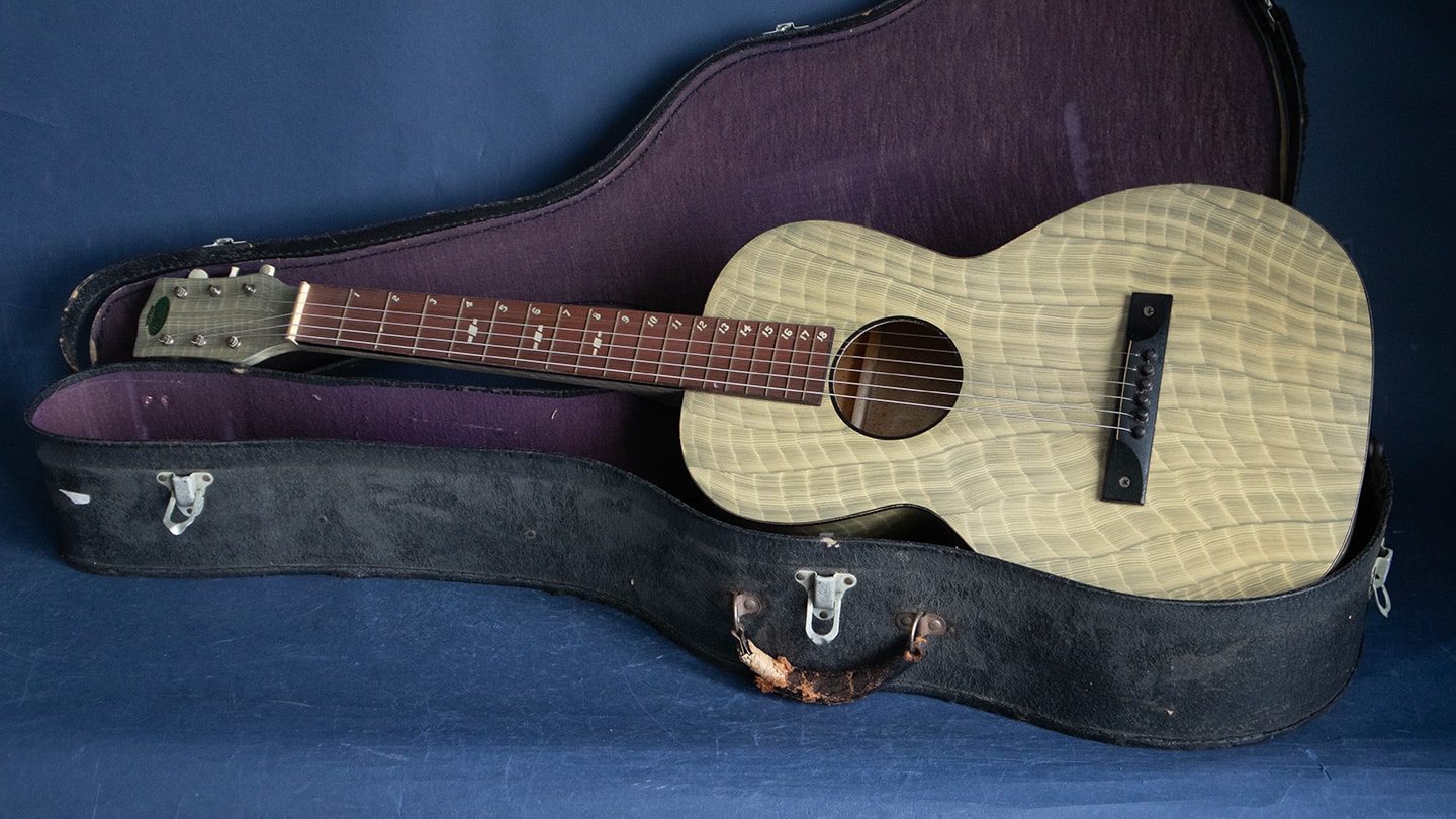 Faux Bamboo finish, square neck Hawaiian acoustic guitar. The opening of the Panama Canal created a Panama California Exposition in 1915-16 to encourage Hawaiian travel Hawaiian music simply enchanted visitors in San Diego. The first uke craze started there and many manufacturers made Hawaiian guitars. Regal made high quality affordable guitar so the American public could try slack key guitar playing. The finish is called Faux Bamboo to look the part. This one sounds great has fresh strings, no cracks or issues. It has changed tuners but the originals are included in the original soft shell case.