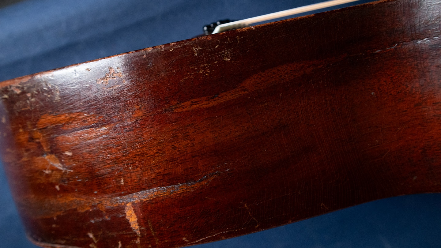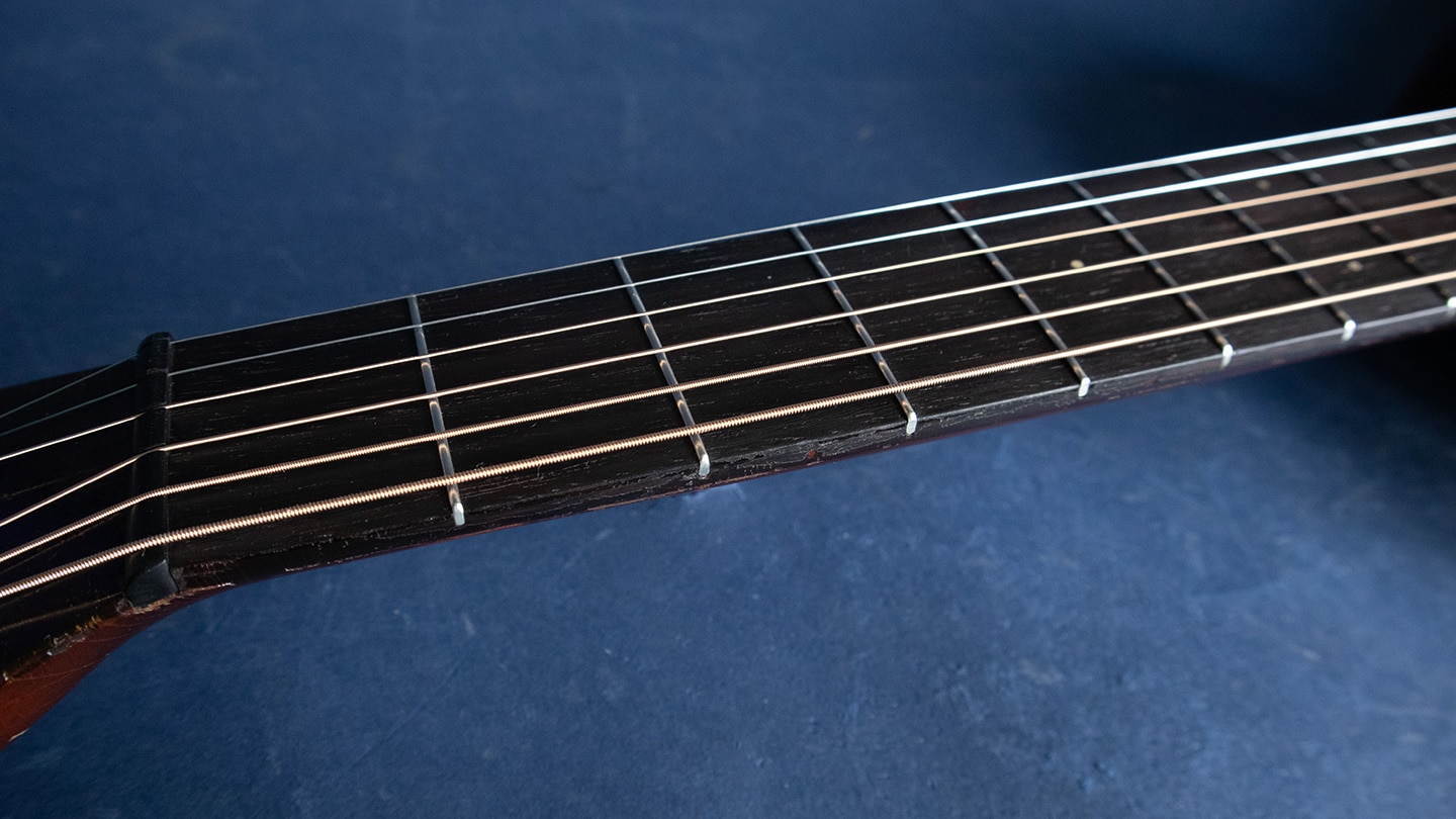 The guitar was sent to Martin ace luthier Steve Kovacik. Steve left a note inside detailing his work. He did a neck reset and fret work on the bar frets. He also reglued a back brace. There is no fret wear. He states the original bridge plate is in good condition with only minimal wear.