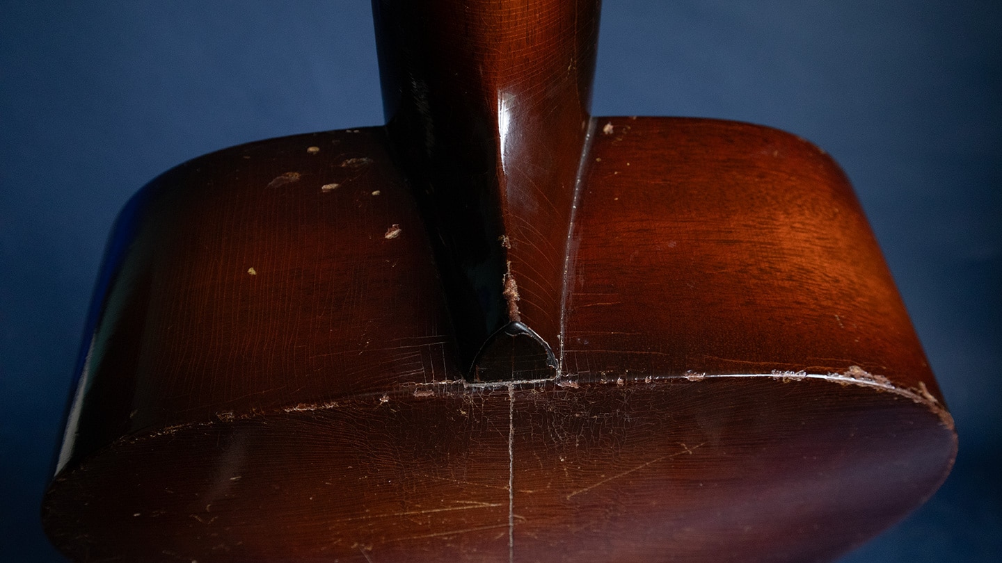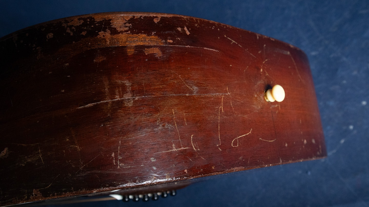 There is a side repair you might say where a jack hole would be. Check the photos for the best description. The tuners are original with no other markings.
