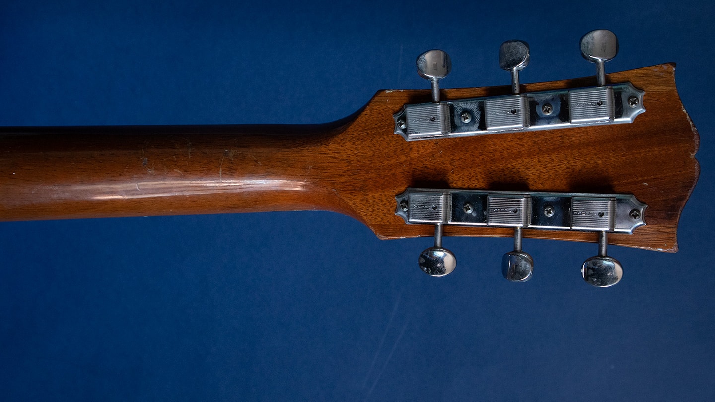 ’56 is a transitional year as they went to the large pickguard and then bigger braces. This has the large pickguard but has skinny braces. The better to hear you with my dear. So, the ’56 and earlier Gibsons were louder and sustained more than the ones made in the late 50’s or 1960’s. Looks like a newer Brazilian Rosewood bridge on this. The neck is a very comfortable medium large with a slight V. It shows light finish checking all over the guitar. There is a well done repaired center seam crack with some overspray over the repaired area. It’s otherwise very clean, not even a strap button or pickup added. The tunere are kluson three on a strip repros with nickel buttons. Its a really nice guitar that sounds great. Our shop looked it over and its in great condition. The action is low and there is plenty of saddle height. Comes with the original soft shell case. A charming guitar.