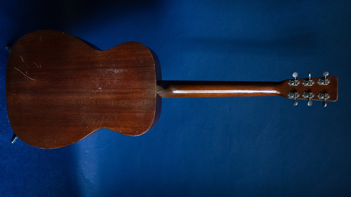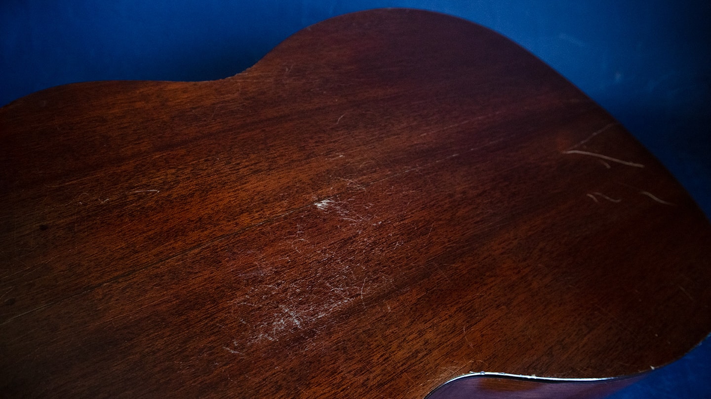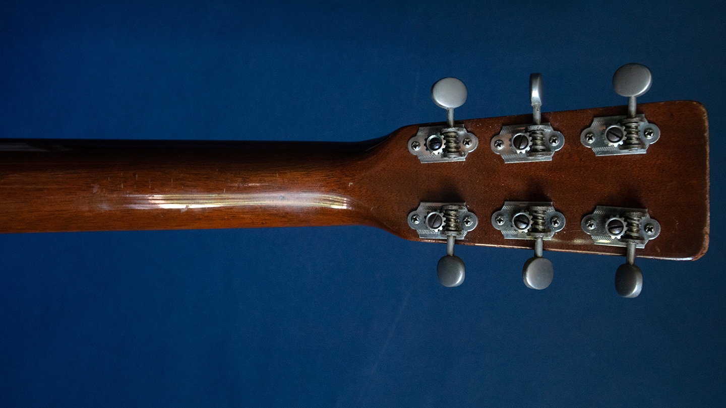 This being an 18 model, it is a mahogany body and neck with an old growth Sitka Spruce top that is now 68 years old. The tone has lots of punch and midrange crunch that is powerful that only a well played vintage Martin can deliver. It’s rather amazing considering its small size. Also has a Brazilian Rosewood fingerboard and bridge. Other repairs include two back cracks fixed long ago and the lower half of the treble side was patched about 3.5” from the end pin. All nice clean work, done long ago. Additionally the back of the neck was oversprayed after an earlier neck reset and some back braces were reglued. Hey, it’s almost 70 years old and it still has the original nickel Grover Sta-tite tuners. Oddly this never had a strap button added. Of course it has many other nicks, dings and scratches of a well loved vintage Martin.