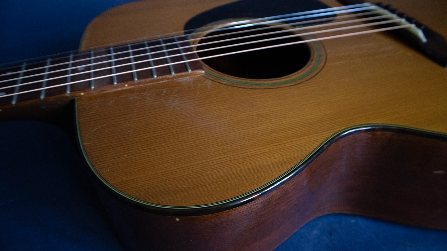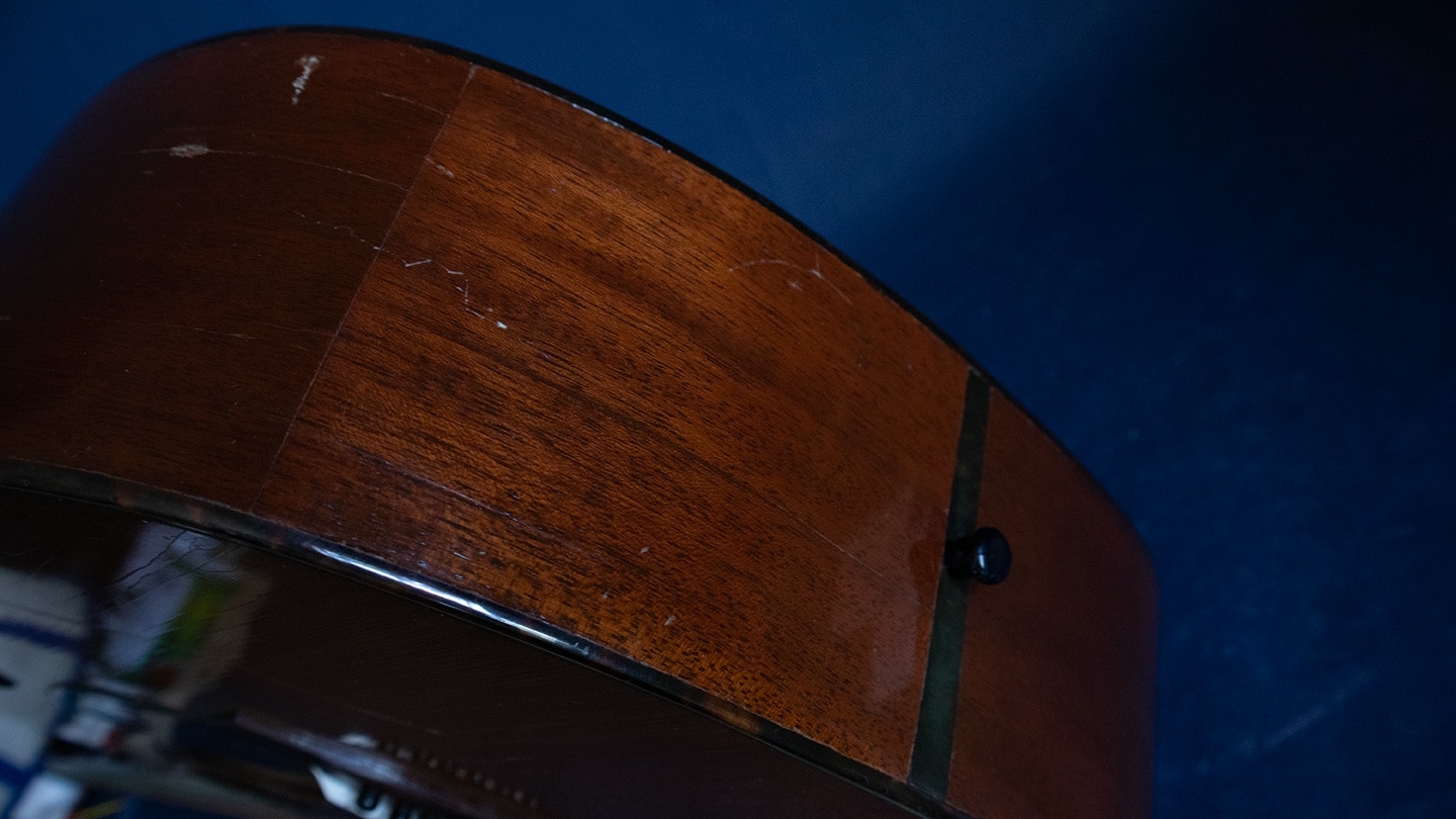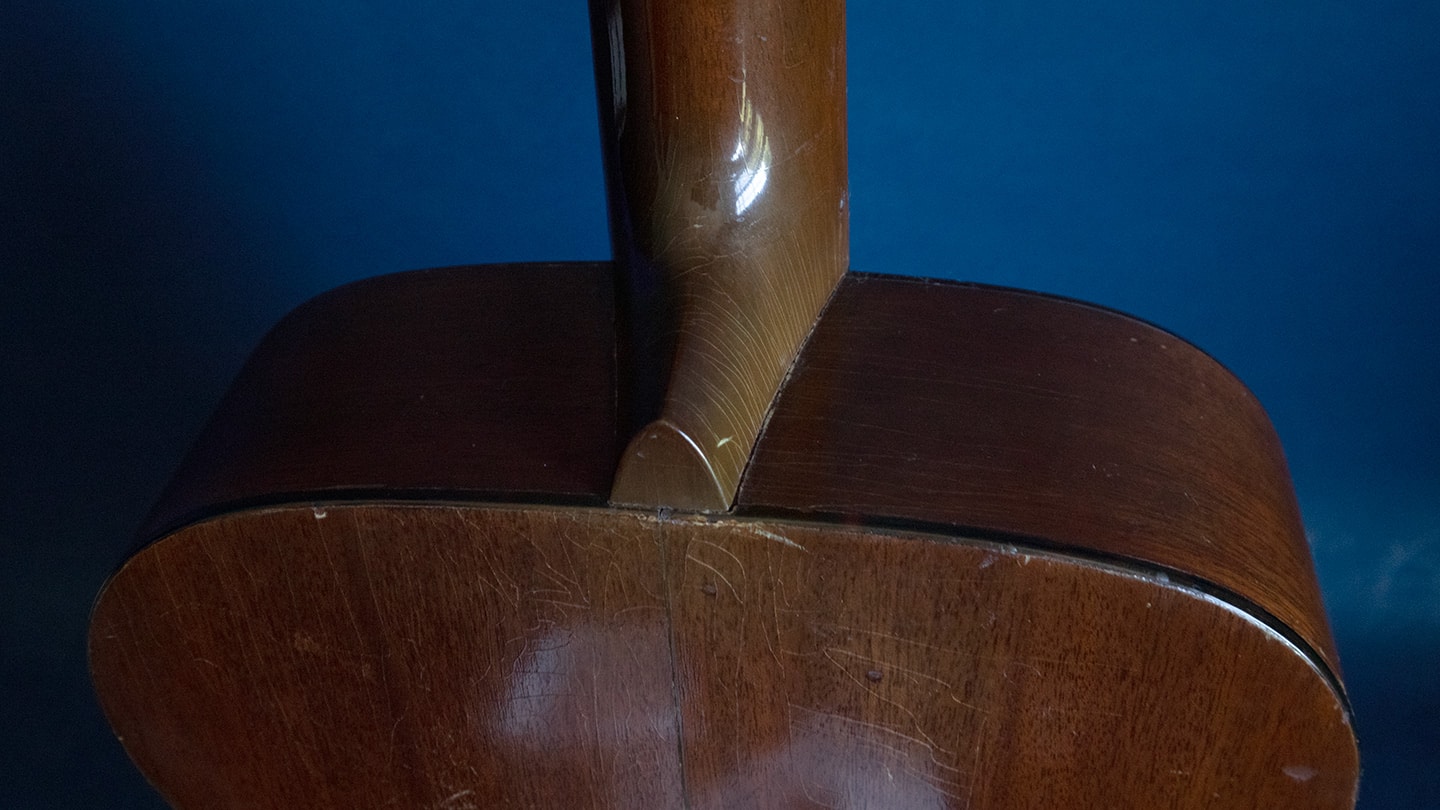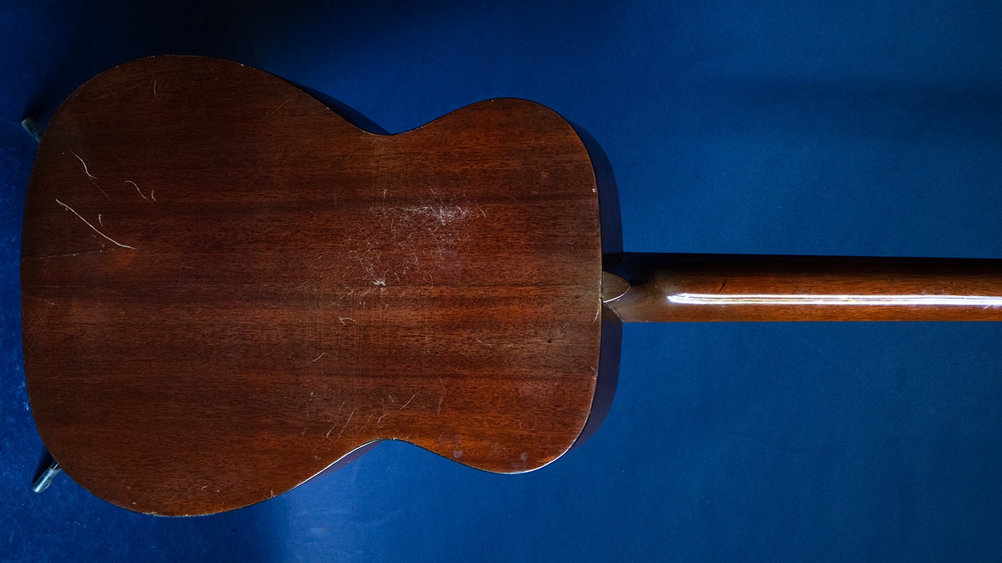 This being an 18 model, it is a mahogany body and neck with an old growth Sitka Spruce top that is now 68 years old. The tone has lots of punch and midrange crunch that is powerful that only a well played vintage Martin can deliver. It’s rather amazing considering its small size. Also has a Brazilian Rosewood fingerboard and bridge. Other repairs include two back cracks fixed long ago and the lower half of the treble side was patched about 3.5” from the end pin. All nice clean work, done long ago. Additionally the back of the neck was oversprayed after an earlier neck reset and some back braces were reglued. Hey, it’s almost 70 years old and it still has the original nickel Grover Sta-tite tuners. Oddly this never had a strap button added. Of course it has many other nicks, dings and scratches of a well loved vintage Martin.