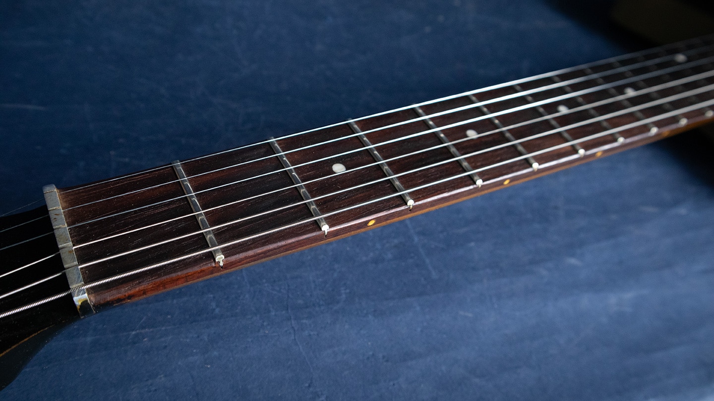 Black, concentric knob, the 25” scale may have been built to fit a budget but they have Brazilian Rosewood fretboards, big frets, and great sounding pickups (ask Jimmy Page). This is one is fairly clean and is freshly strung and has a variety of tones. Comes with the original soft shell case.