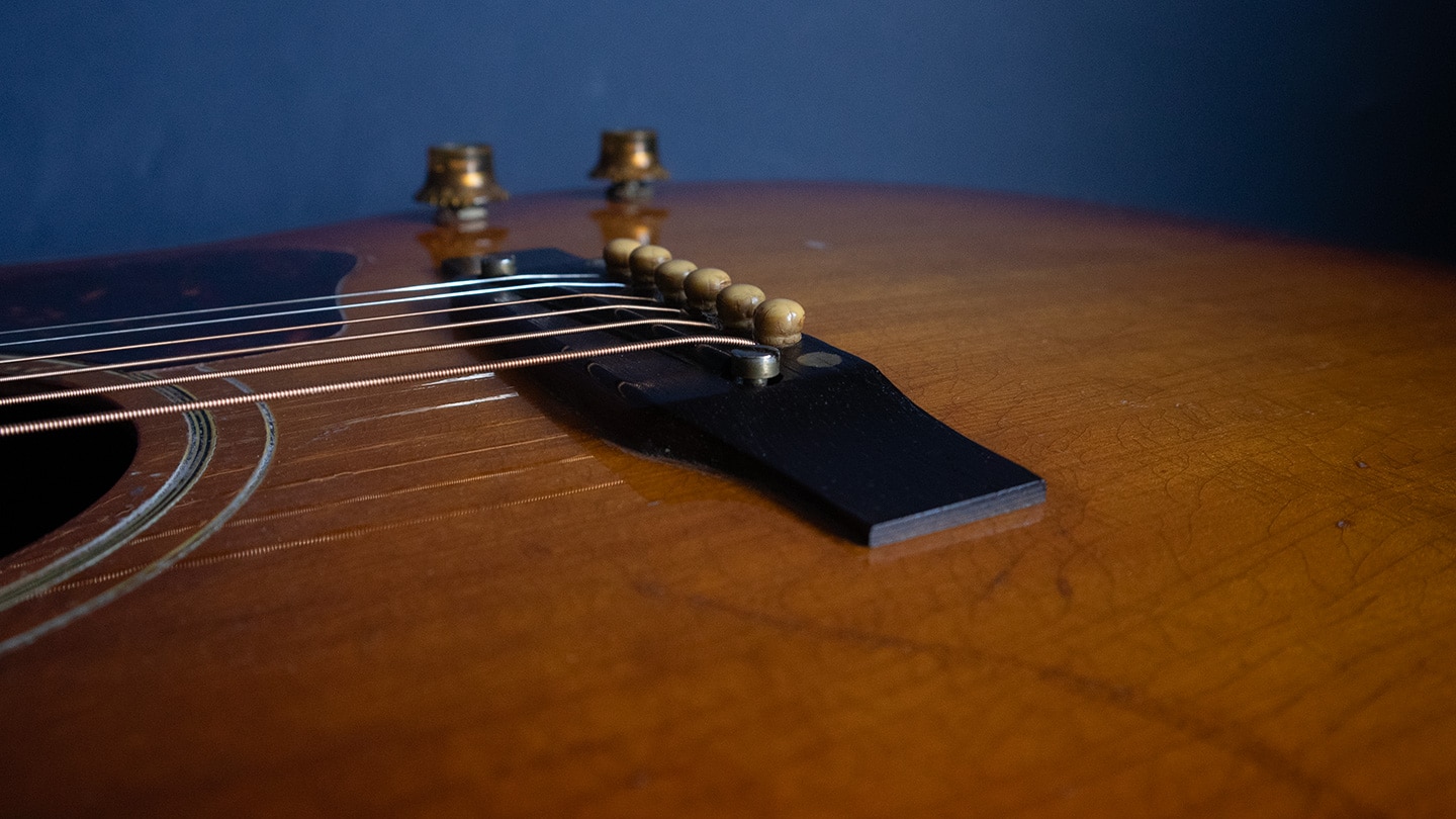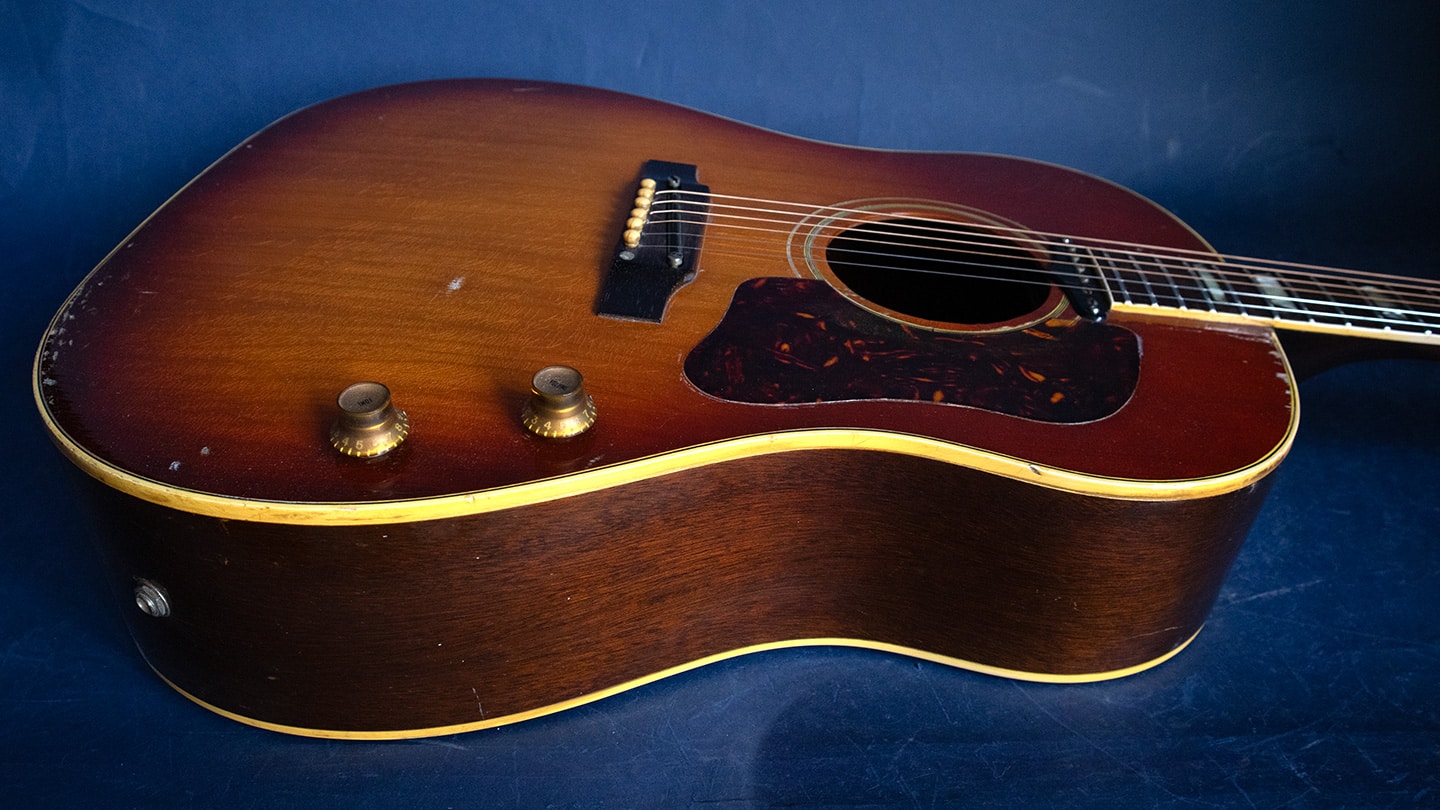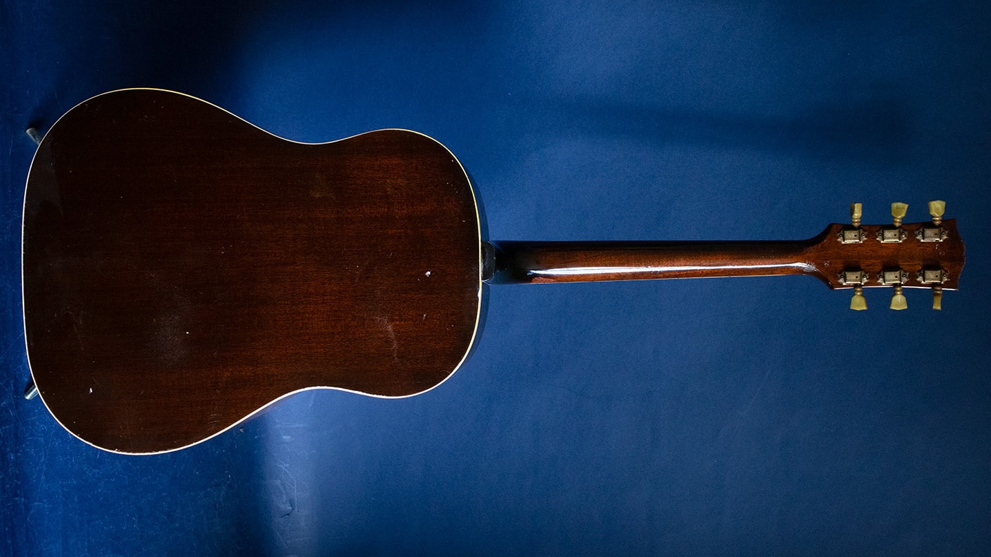 Sunburst, honestly one of the better sounding J-160E’s we’ve had. These were designed as stage guitars with an adjustable P-90 pickup and one volume and tone control that is easy to see and reach. They are also ladder braced to prevent feedback on stage. John Lennon used a 1964 model on “I Want to Hold your Hand” “Nowhere Man” and “Girl”. You know how this sounds.