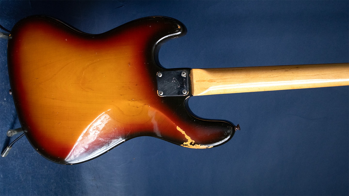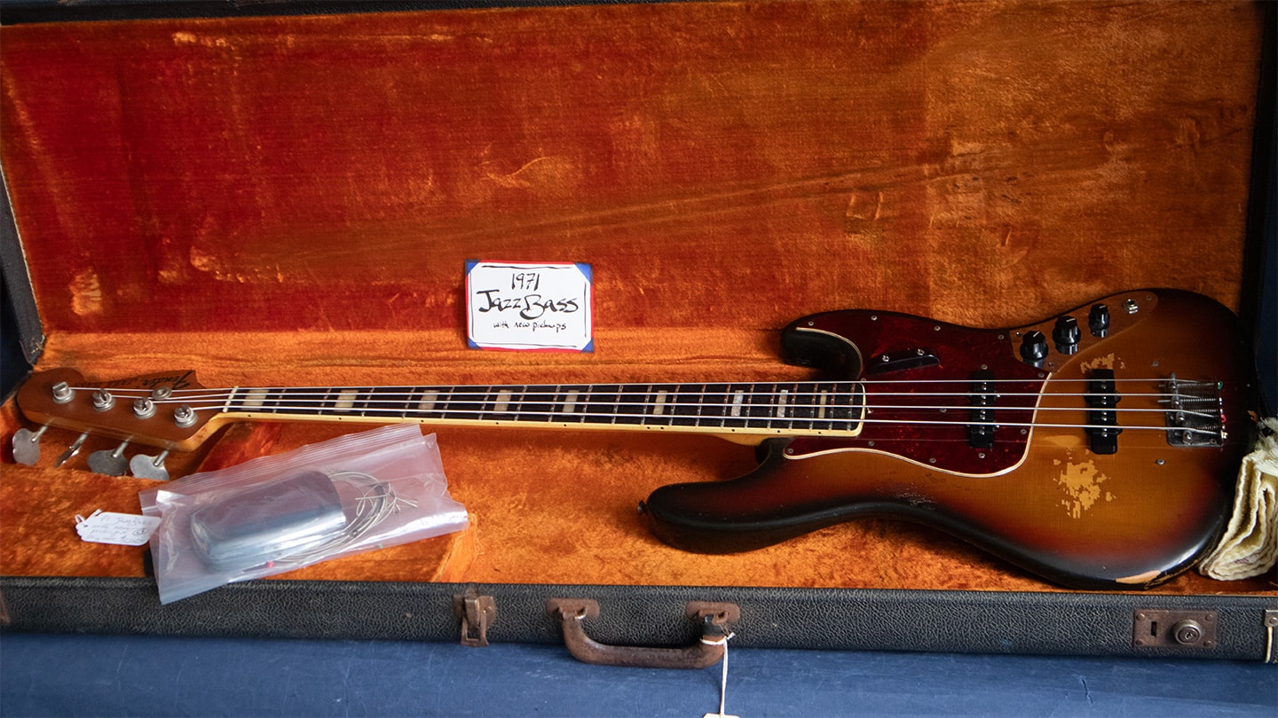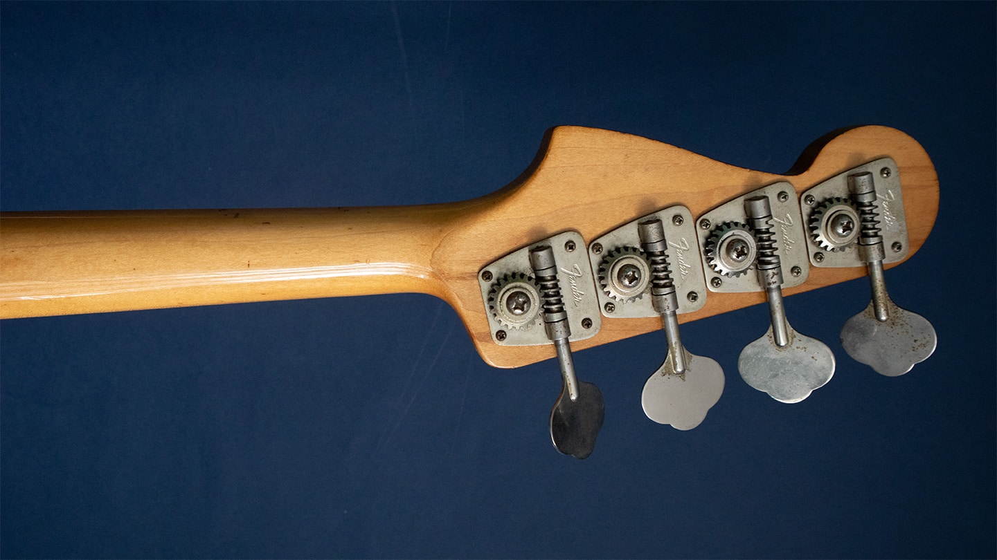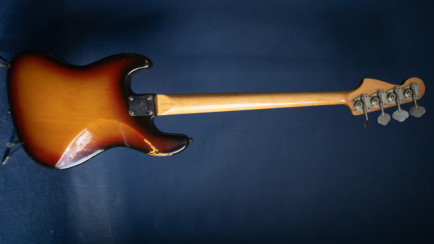 Sunburst, VG+, neck and pots both dated 1971. A very resonant and long sustaining bass from the four bolt neck era. A nice rounded neck. We love Strat and Jazz bass necks from this era. The pickups are made by Ted Vig and sound great and are well matched. The body has a good color and wood grain. It does show more playing wear on the front and some on the back. This one has been played and sounds all the better for it. Comes with the original hard case and bridge cover.