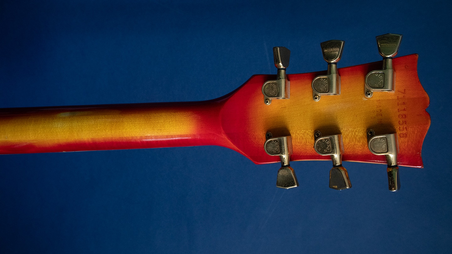 Cherry Sunburst – and it’s the full late 1970s Norlin treatment – every continuous surface of the guitar other than the bound ebony fingerboard is bursted. No breaks, and lighter than is typical of ‘70s Customs. Replaced saddles, gold Duncan Antiquity humbuckers, what looks to be a new nut, and a newer hard case, otherwise stock. The Honduran mahogany body is not the “sandwich” type, Gibson having done away with that feature during 1978. Otherwise, typical Norlin features of the period – volute, maple neck, “Made in USA” stamp, Grover tuners, and so forth. Structurally excellent, fully functional truss rod, frets are in pretty decent shape, and the guitar plays very well and sounds fantastic. Great looks, great tones, responsive and articulate. A Cherry Sunburst Custom with Duncan pickups – get your Zappa on! Made in Nashville, Tennessee, USA.