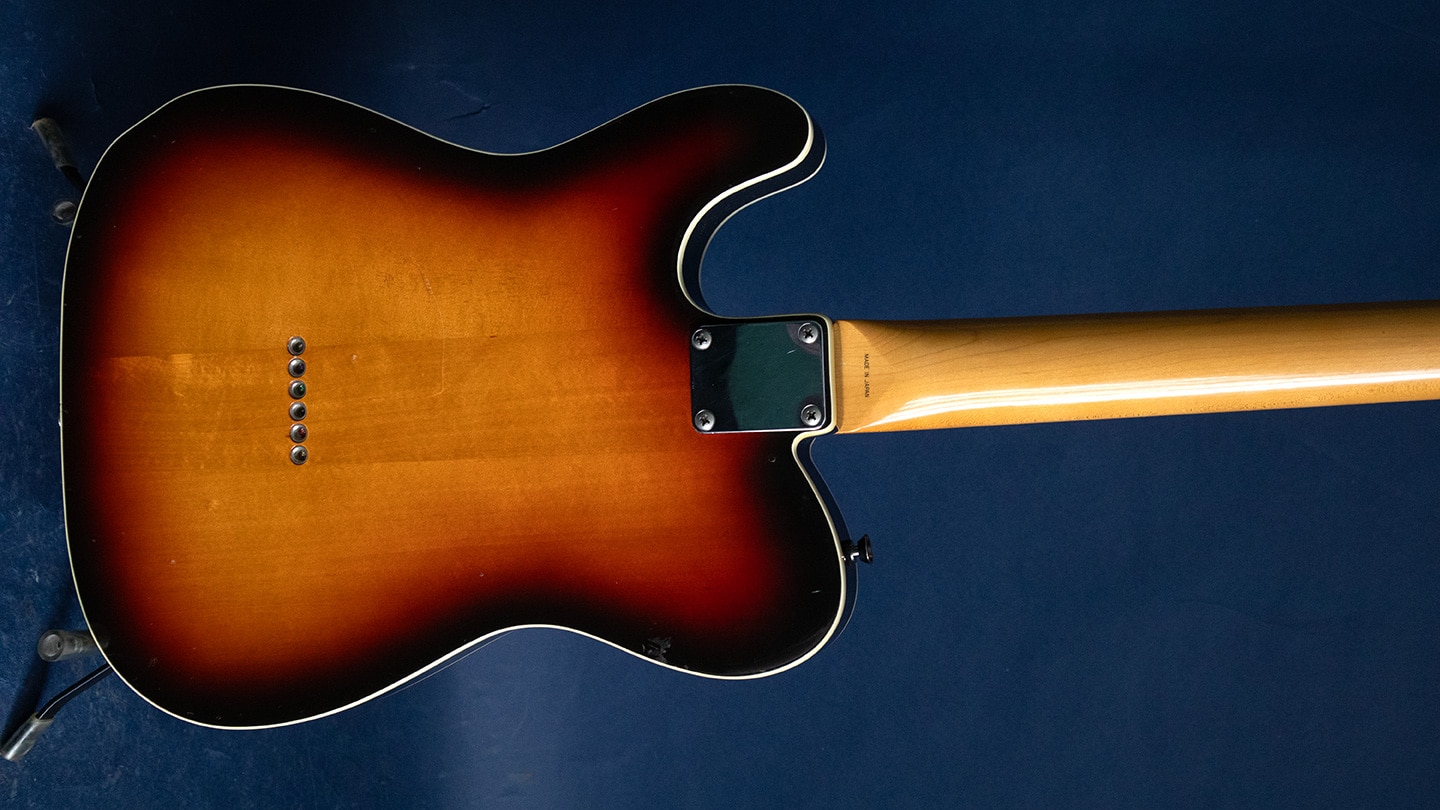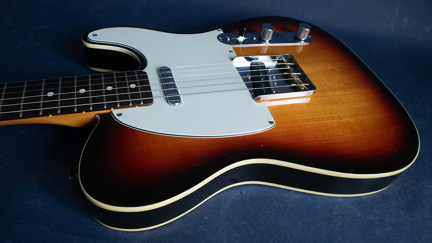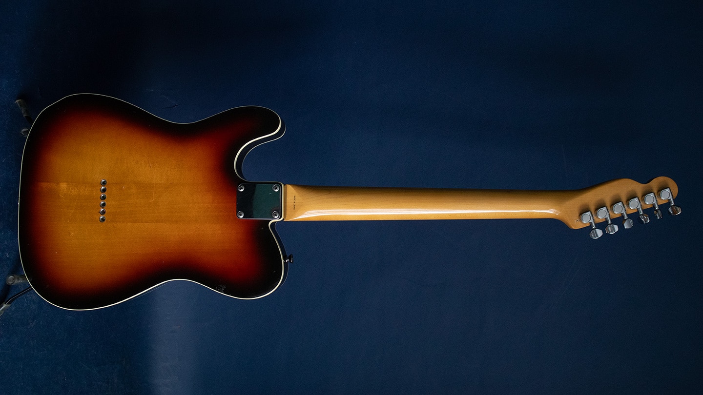 Three Color Sunburst, double bound body. A nice light cool looking MIJ Telecaster with upgrades. They include Custom Shop Twisted Tele pickups, new tuners, new pots and a new bridge. The serial number was on the old bridge but the new bridge is a Fender deluxe with brass saddles. The pickups sound…well…custom shop like great! The old string tree screw is in the headstock next to the new string tree. Nice and light at 7.4 pounds. Comes with a brown hard shell case.