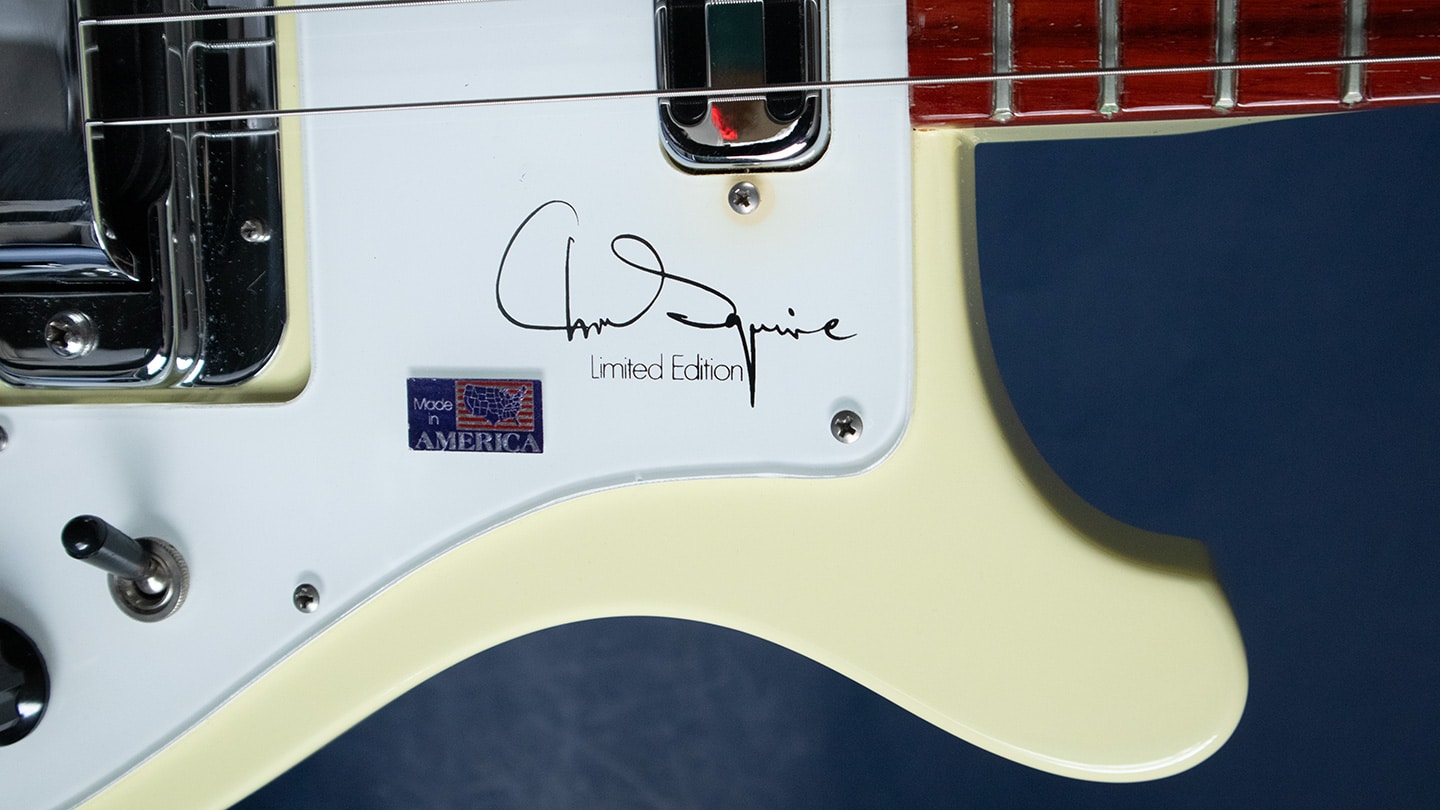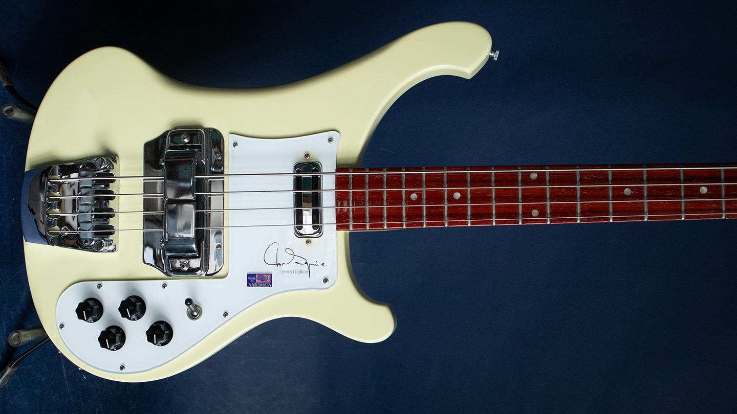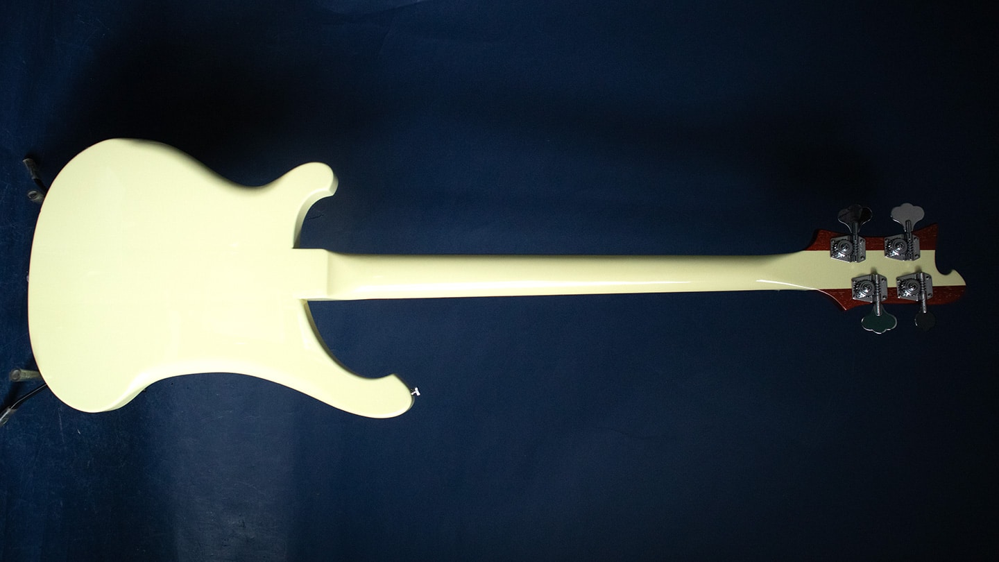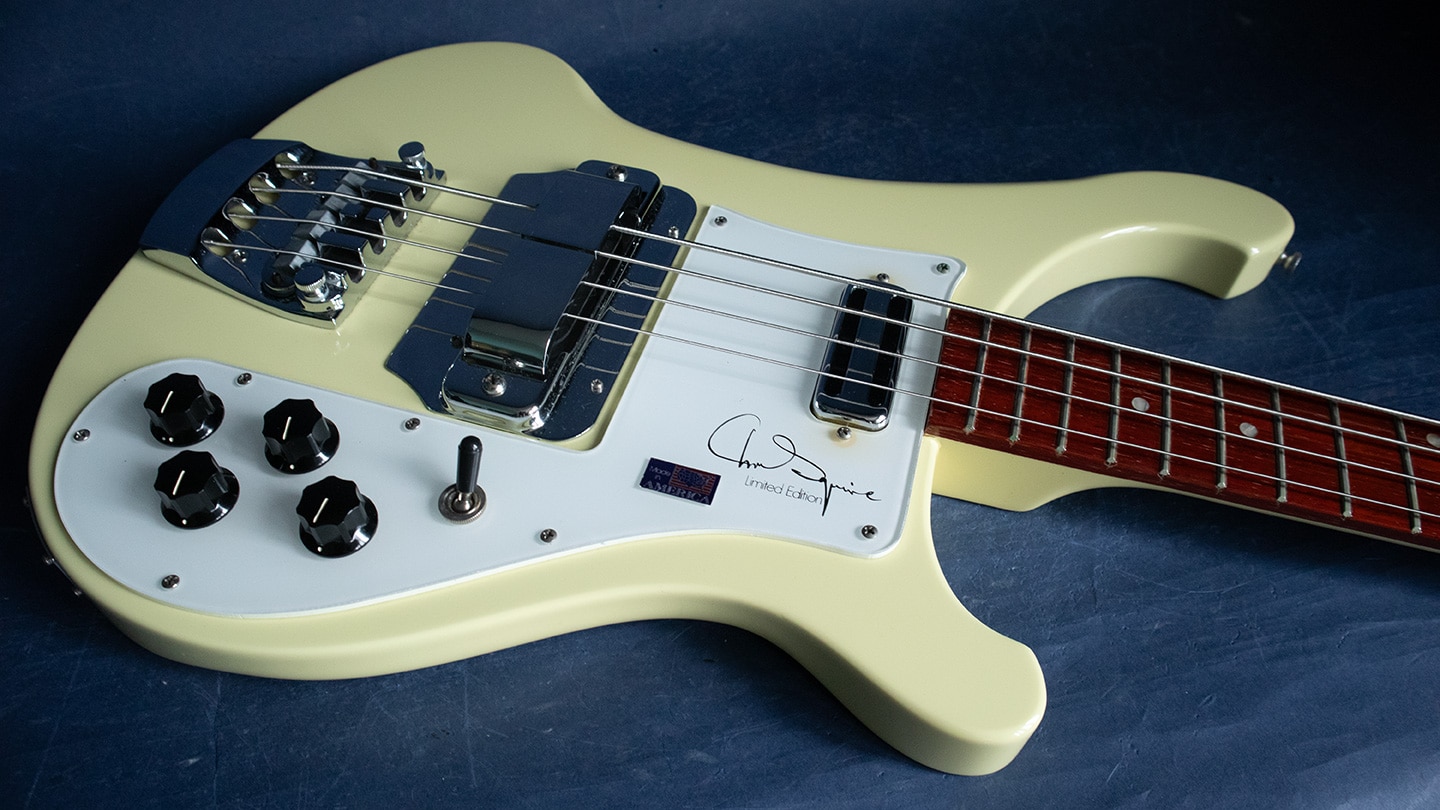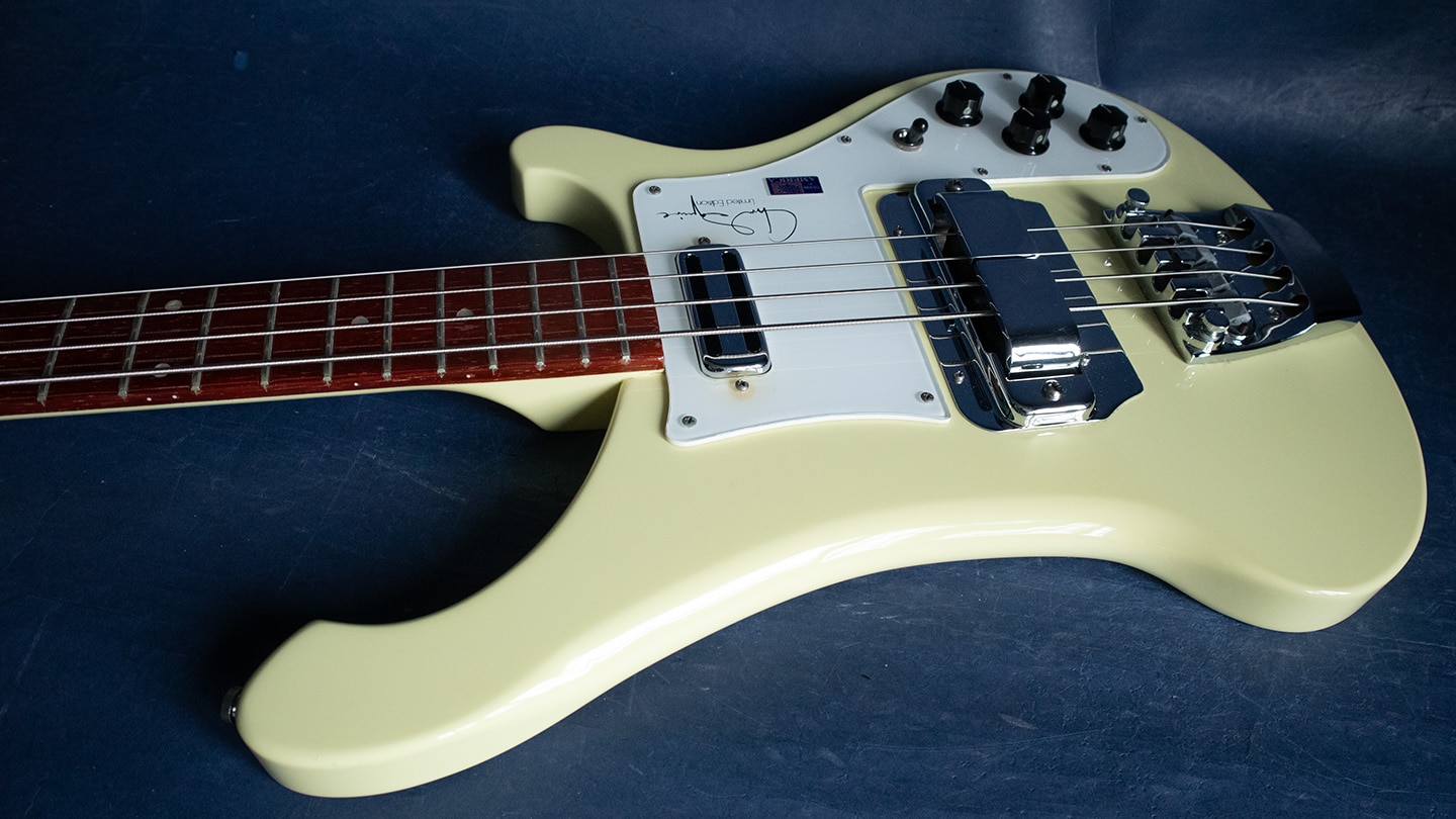 Very clean and all-original, in its original silver tolex hard case with a letter of provenance from Rickenbacker indicating that it was number 596 of 1,000 made, and was made on January 15, 1996. Cream Colorglo finish, signature model for the brilliant bassist for Yes, Chris Squire, based on his 1964 Rickenbacker RM1999 (the Rose-Morris export model of the 4001S). Neck-through maple/walnut neck with maple body wings, unbound lacquered African Vermilion (sometimes called African Padauk) fingerboard with dot inlays, and the same wood is used for the headstock wings. Other features include a pair of “toaster” pickups with individual volume and tone controls and a three-way selector switch, open-back tuners, and a lucite pickguard printed with Chris Squire’s signature. Sounds and plays great, attractive color, and associated with an incredible and much-missed musician. and very collectible. Made in Santa Ana, California, USA.