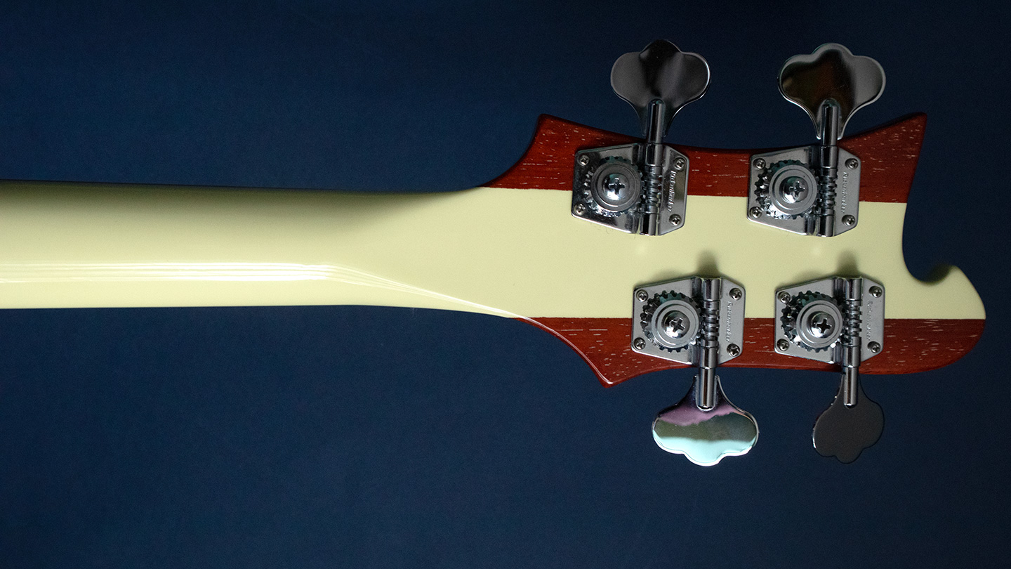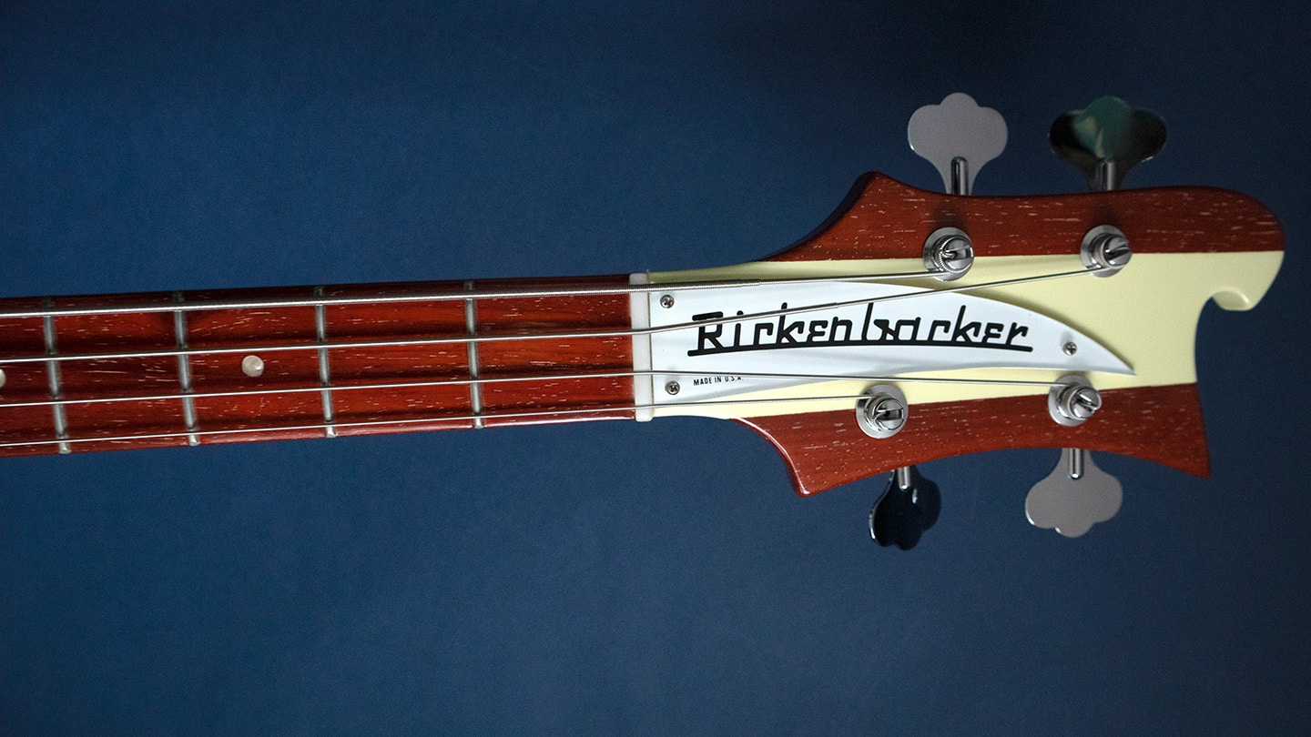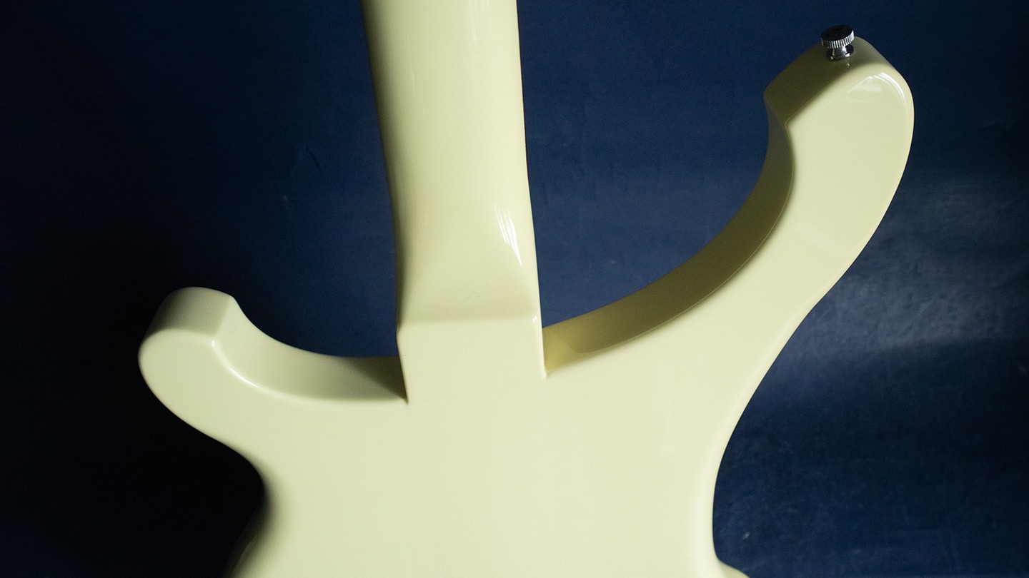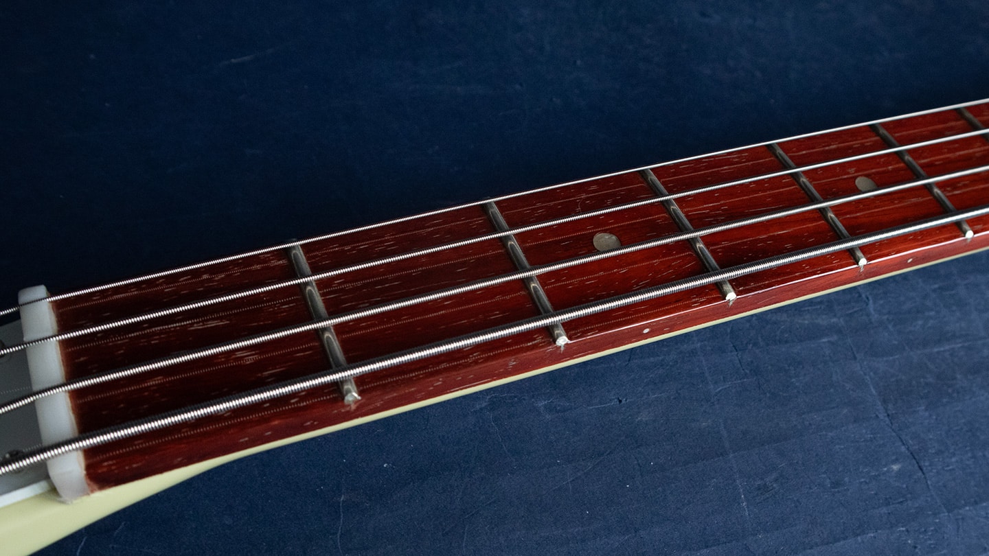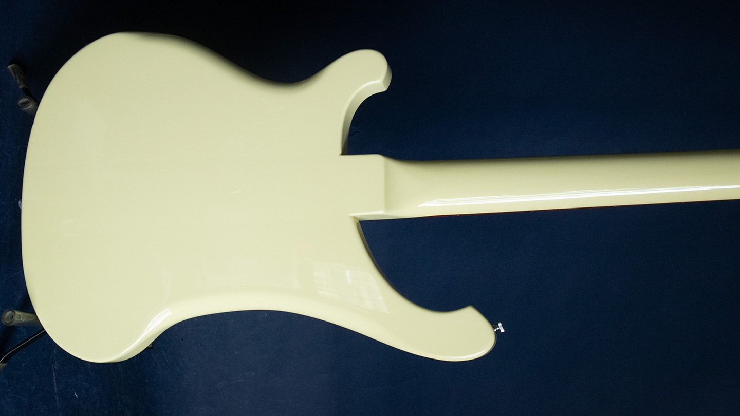 Very clean and all-original, in its original silver tolex hard case with a letter of provenance from Rickenbacker indicating that it was number 596 of 1,000 made, and was made on January 15, 1996. Cream Colorglo finish, signature model for the brilliant bassist for Yes, Chris Squire, based on his 1964 Rickenbacker RM1999 (the Rose-Morris export model of the 4001S). Neck-through maple/walnut neck with maple body wings, unbound lacquered African Vermilion (sometimes called African Padauk) fingerboard with dot inlays, and the same wood is used for the headstock wings. Other features include a pair of “toaster” pickups with individual volume and tone controls and a three-way selector switch, open-back tuners, and a lucite pickguard printed with Chris Squire’s signature. Sounds and plays great, attractive color, and associated with an incredible and much-missed musician. and very collectible. Made in Santa Ana, California, USA.