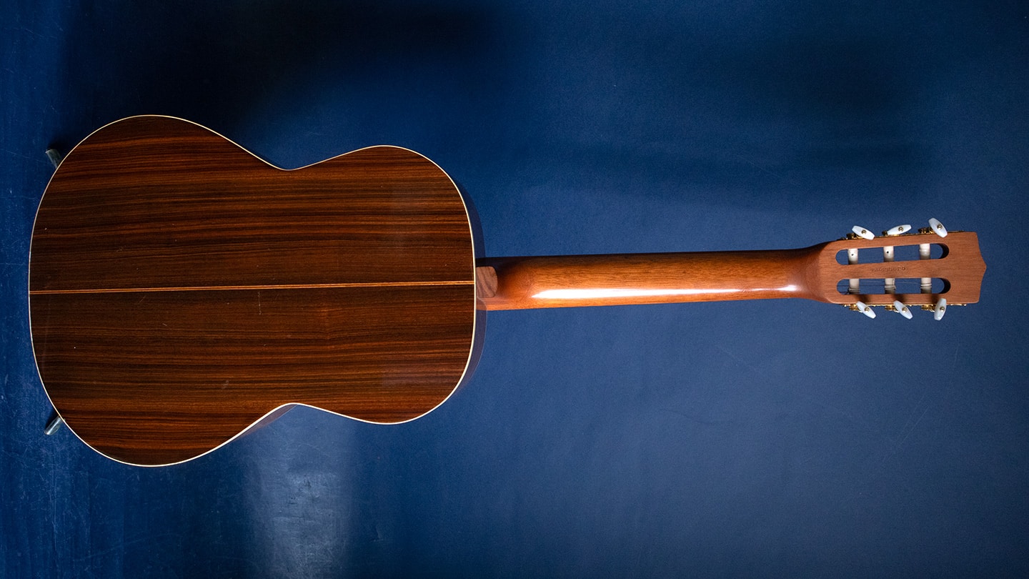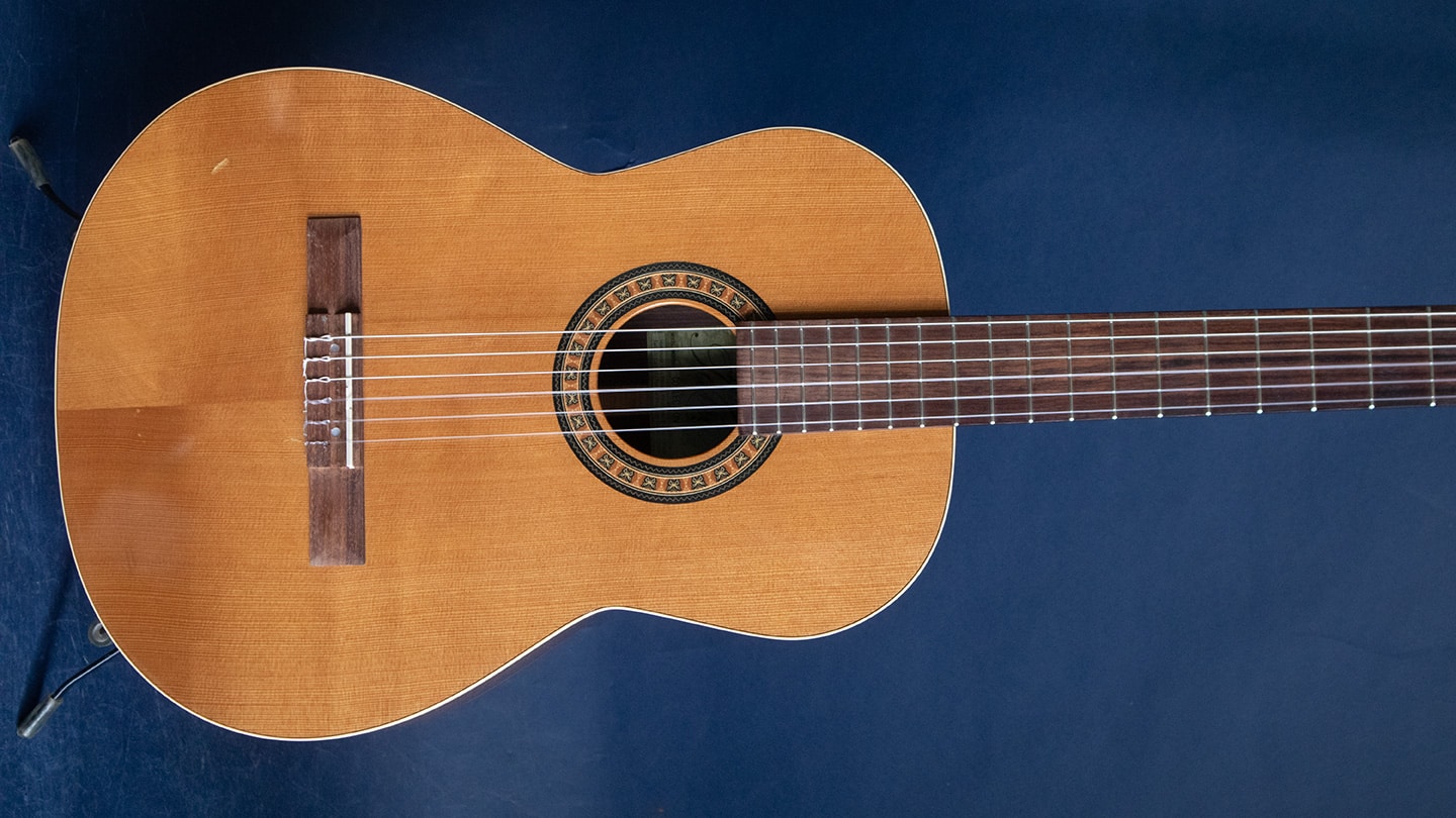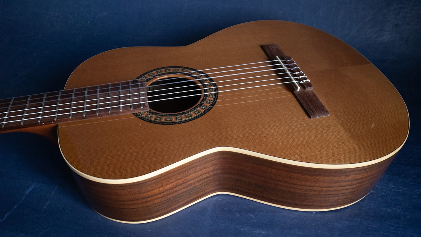 Natural, Cedar top, laminate rosewood back and sides, rosewood fingerboard with wide nut, shows some nicks and scratches on top and back. Everyone needs a classical guitar. Here is a friend for writing and wandering this spring. Sorry, no case.