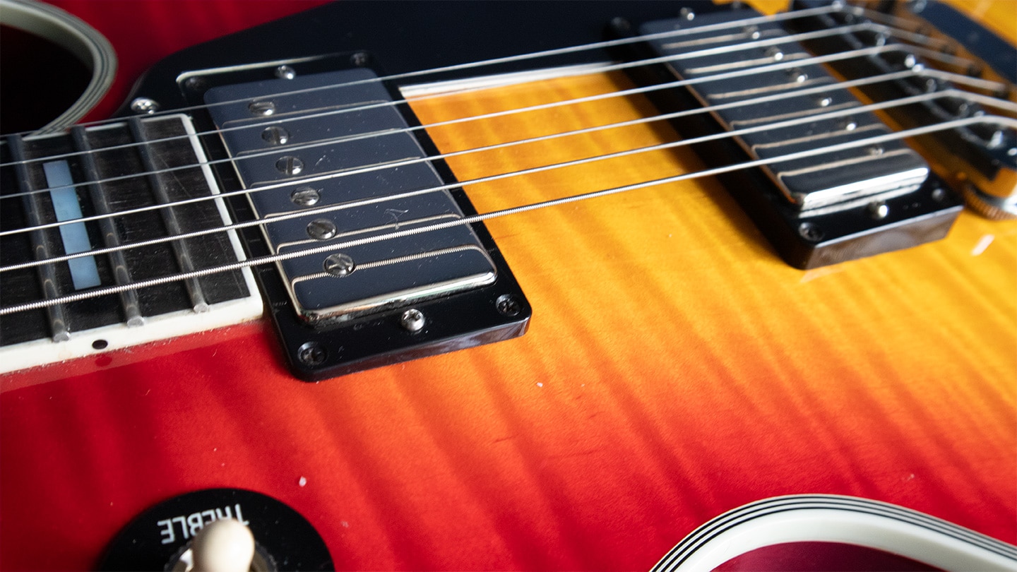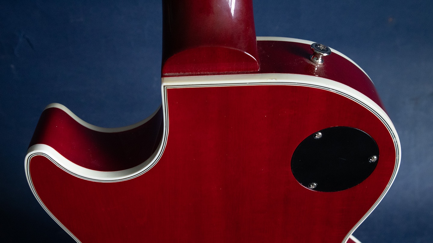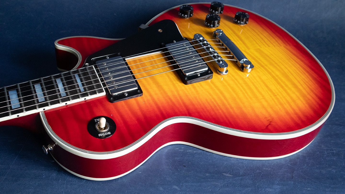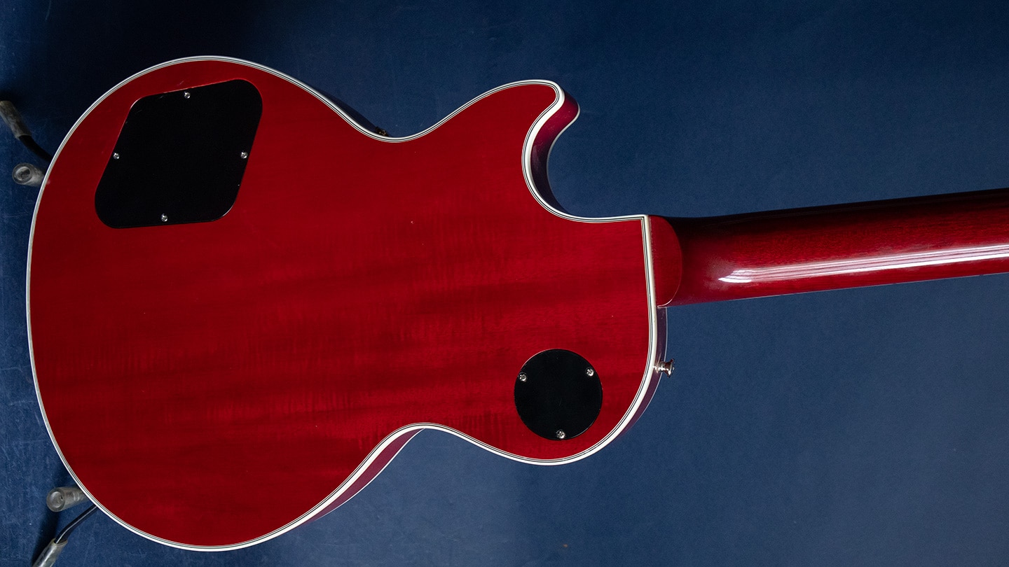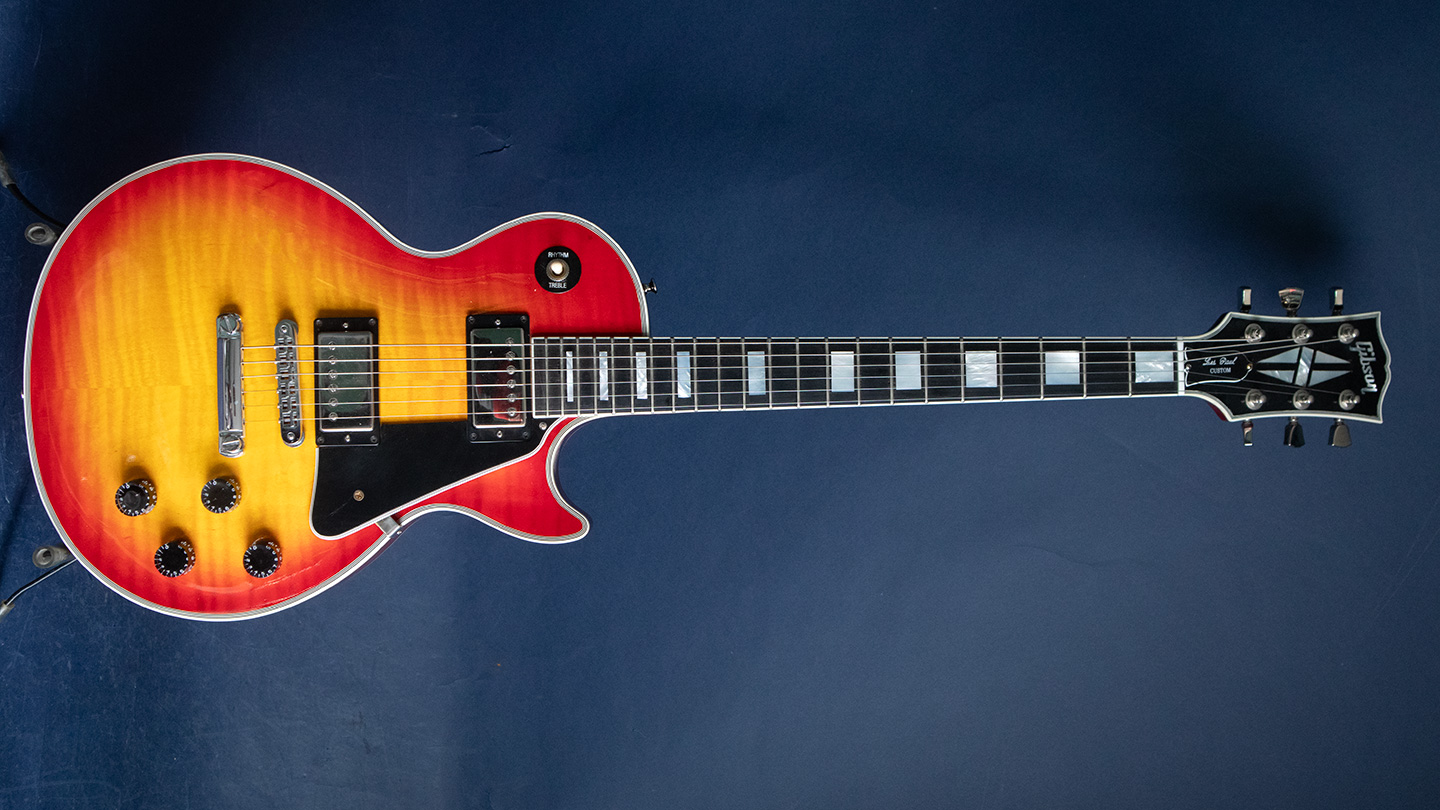 Cherry Sunburst with a beautiful flame maple top. This was converted to nickel parts and has a set of Seymour Duncan Slash pickups. Also has a repaired headstock. These are Alnico II pickups with a hotter wind. They are great for driving an amp yet has more clarity than you might find with other hotter pickups. The flamed maple top really stands out on this. Has a medium large rounded neck profile. The frets show almost no wear and it is set up for fast action. There is a bit of jean rivet wear on the back and a few dings and scratches but no abuse and is pretty clean overall. Comes with the original COA and papers in the original hard case.