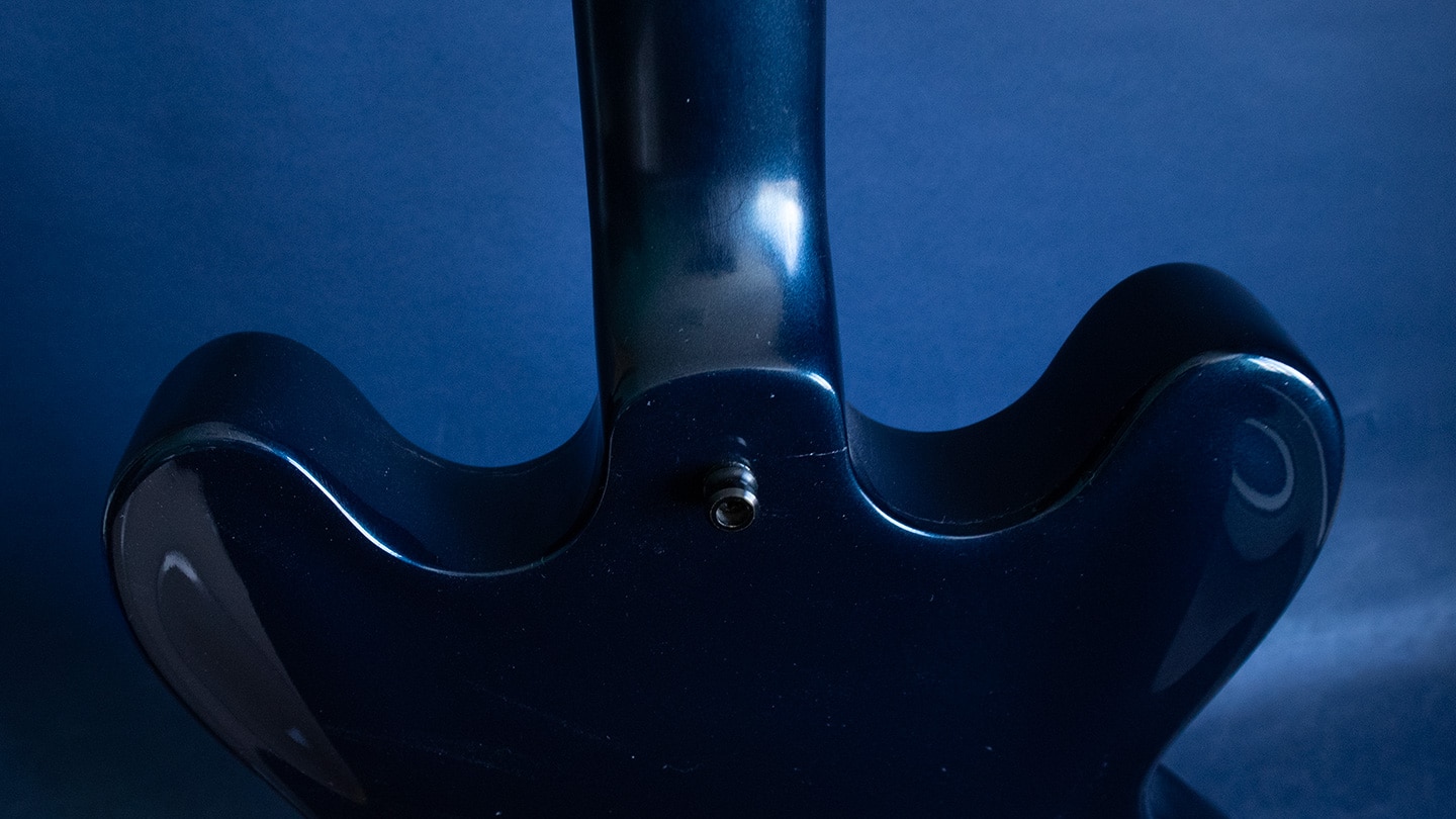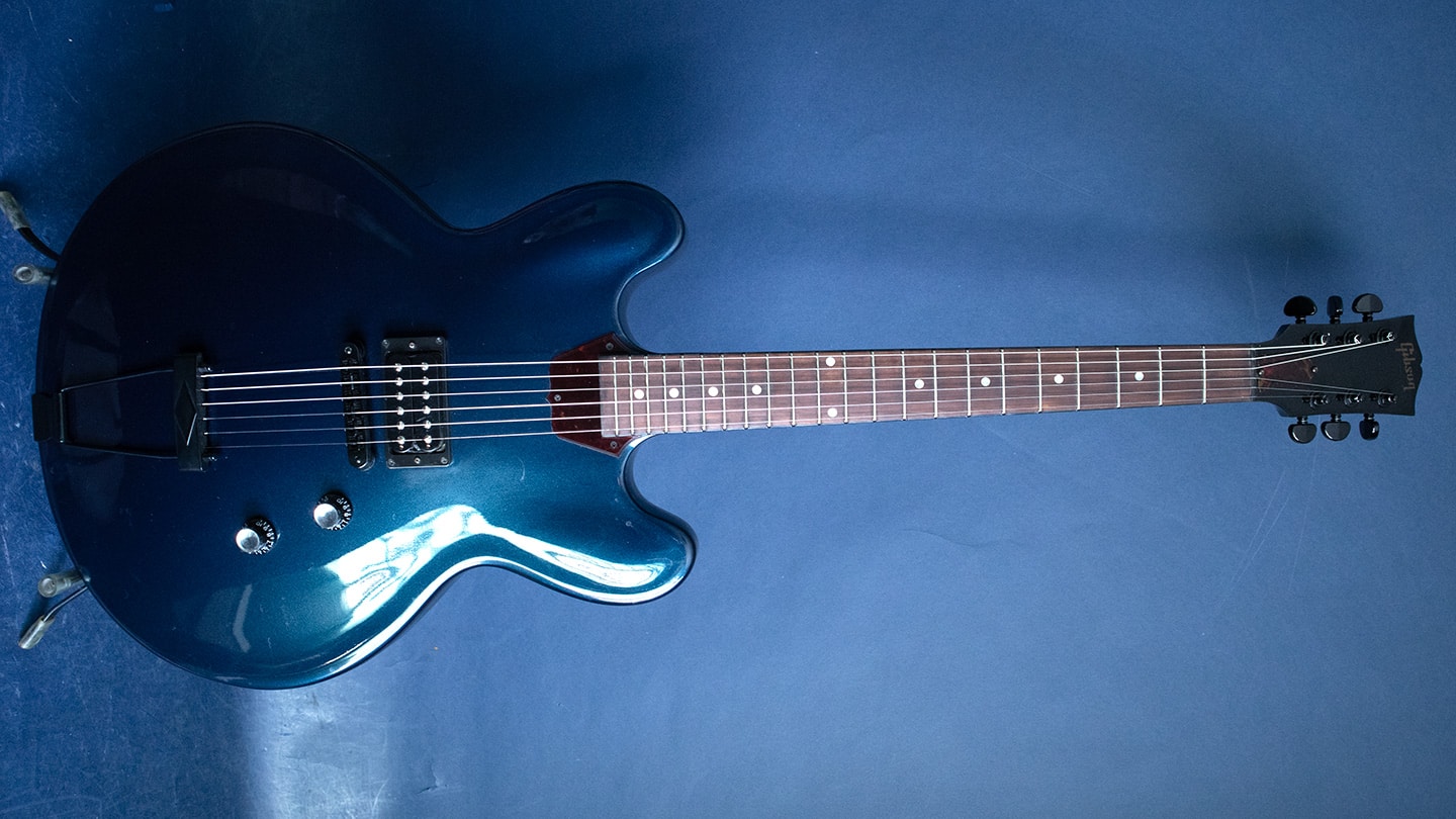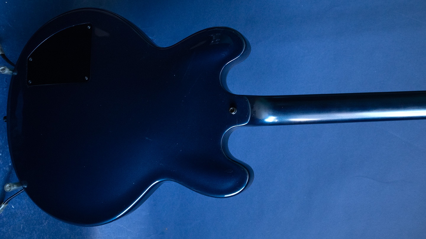 Midnight Blue, a rather hard to find 335 variant. Imagine if someone at Gibson played in a punk rock band and designed a 335. Who needs F holes? Still has a semi-hollow laminate maple body but black binding and black hardware. This is an early version with a trapeze bridge and the Dirty Fingers pickup with two rows of adjustable pole pieces. This is nice, it has a back panel for easy access to the electronics. Of course with no F holes what else would they do? This does have scratches and a few dings and finish wear on the back of the neck. But otherwise it’s in good shape and stock. All stock with a mahogany neck, 12” radius board, 24.75” scale as you’d expect on a 335. Comes with a Gibson gig bag.