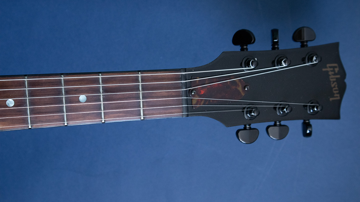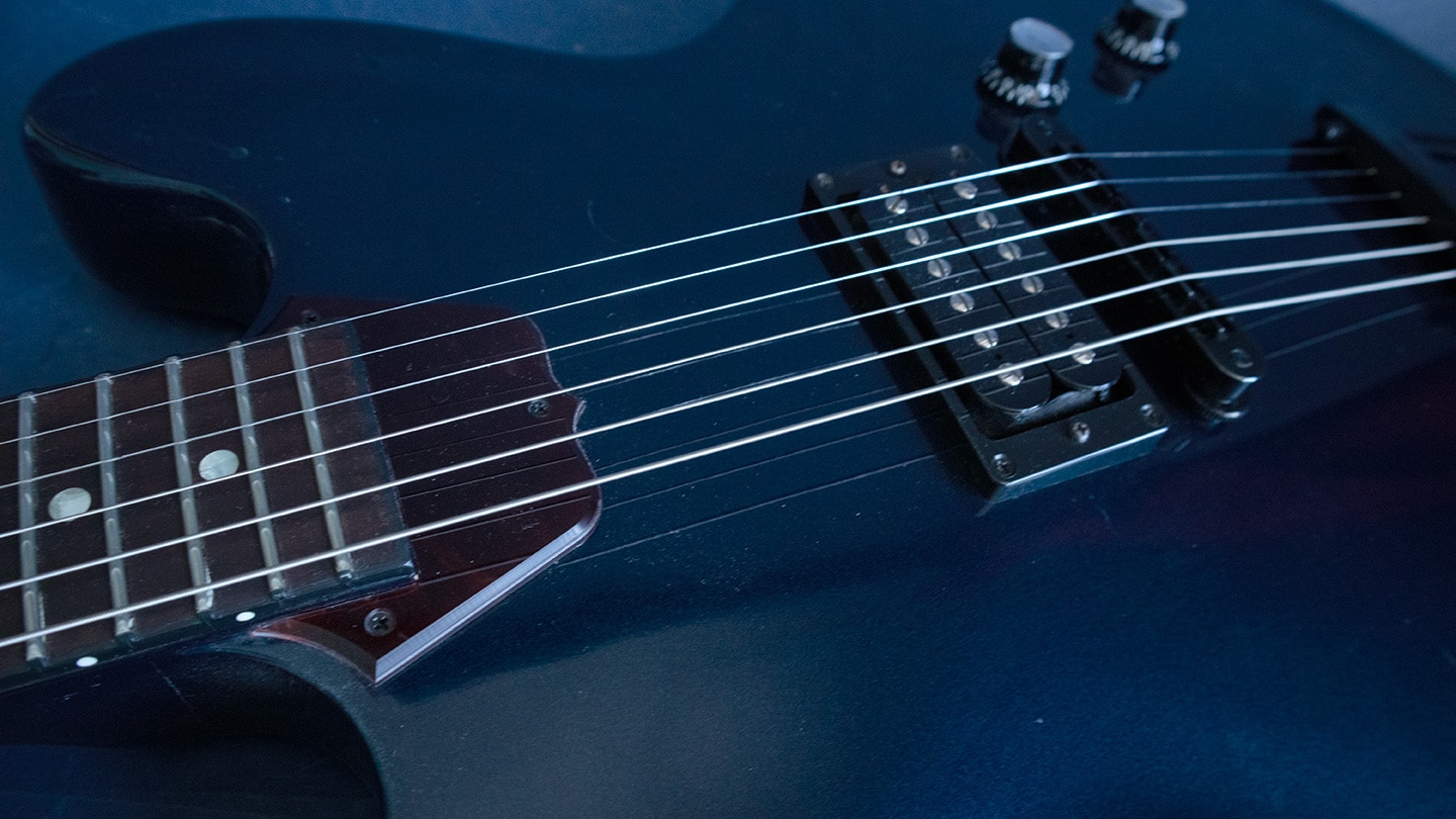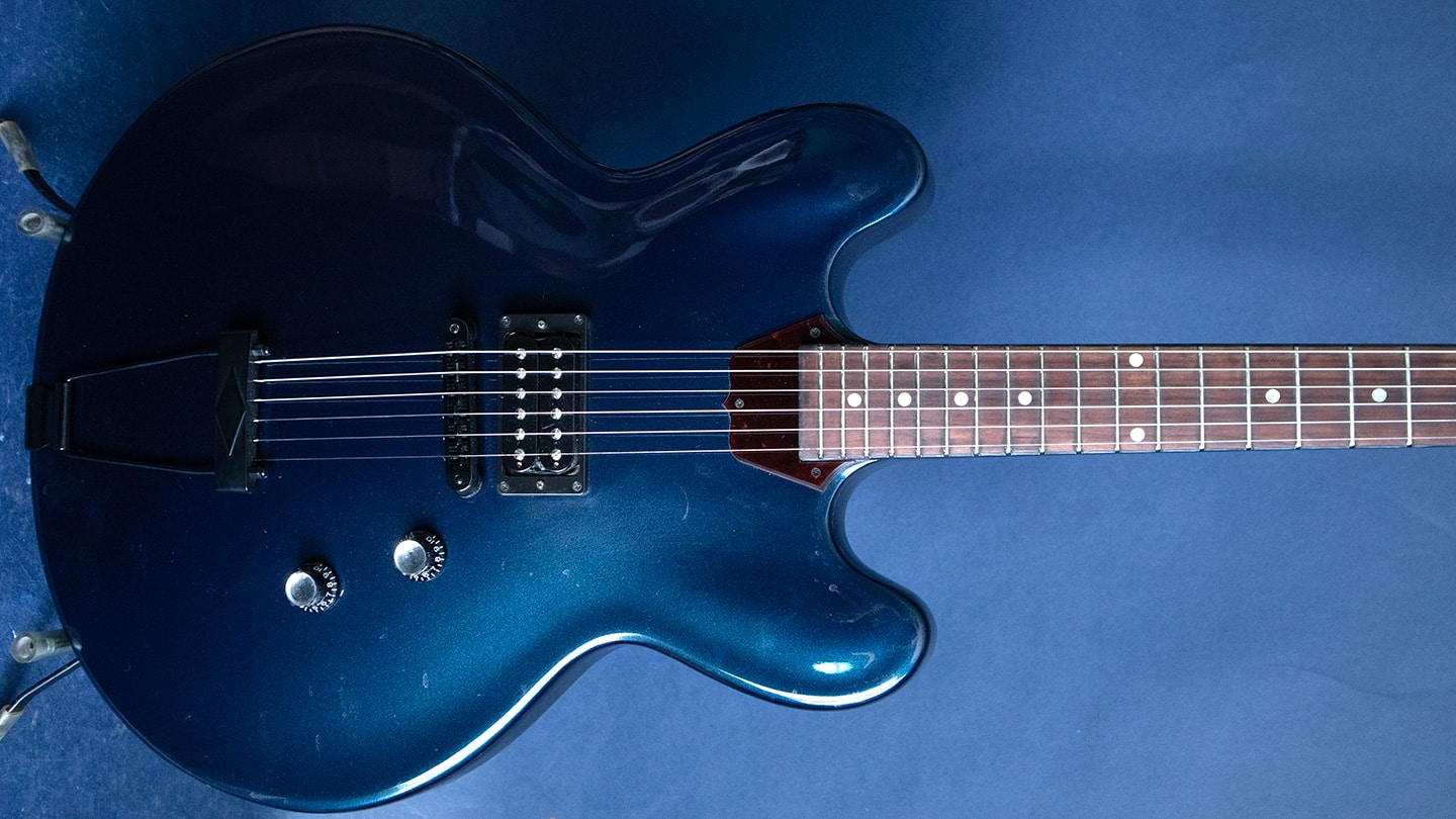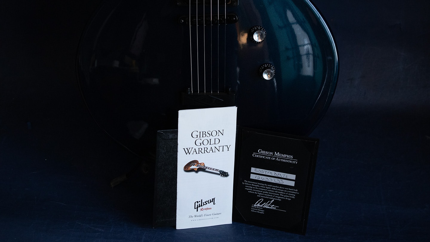 Midnight Blue, a rather hard to find 335 variant. Imagine if someone at Gibson played in a punk rock band and designed a 335. Who needs F holes? Still has a semi-hollow laminate maple body but black binding and black hardware. This is an early version with a trapeze bridge and the Dirty Fingers pickup with two rows of adjustable pole pieces. This is nice, it has a back panel for easy access to the electronics. Of course with no F holes what else would they do? This does have scratches and a few dings and finish wear on the back of the neck. But otherwise it’s in good shape and stock. All stock with a mahogany neck, 12” radius board, 24.75” scale as you’d expect on a 335. Comes with a Gibson gig bag.