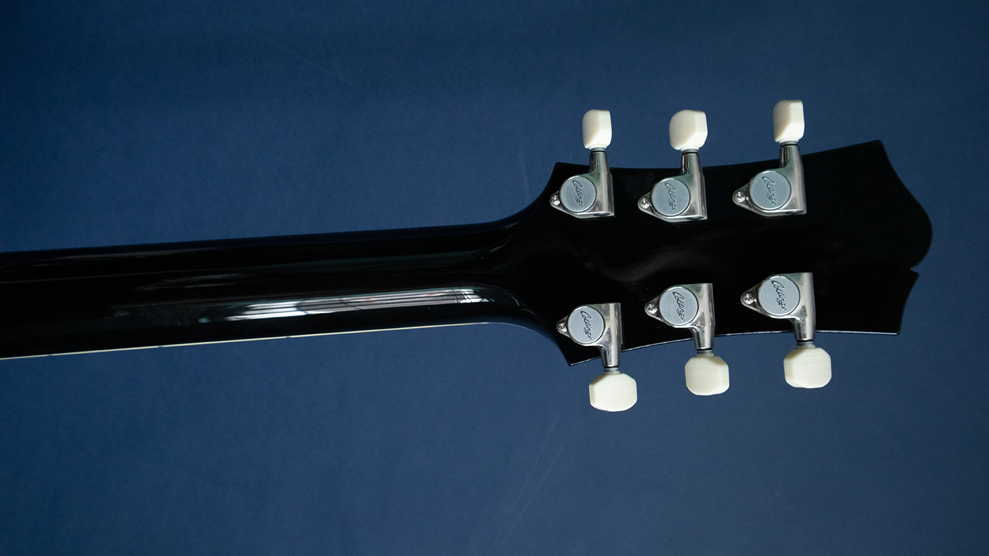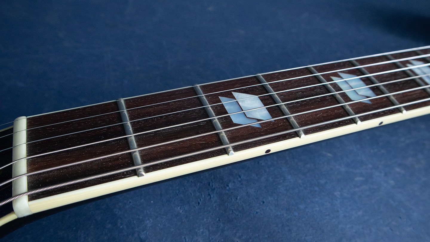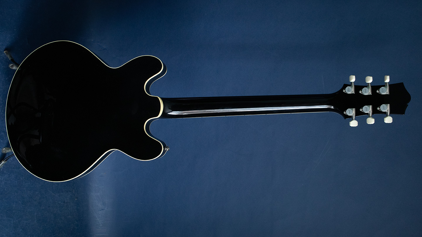 Jet Black, in excellent condition, the deluxe version has grained ivoroid binding on the body, fretboard, truss rod cover and headstock. They also have custom made ivoroid knobs, tuner buttons and pickup rings. Deluxe indeed. Plus this one has the amazing looking optional double parallelogram inlays.