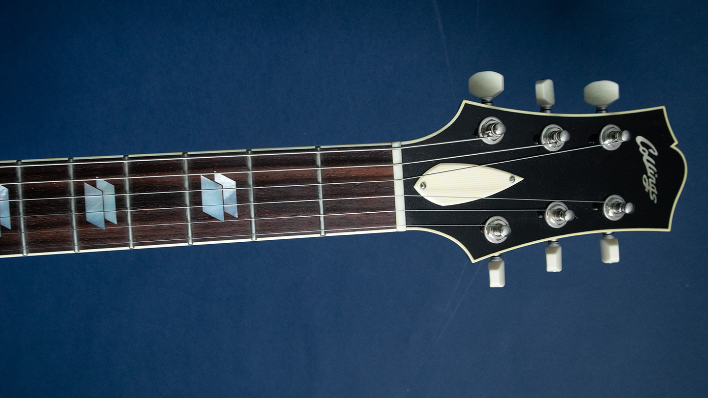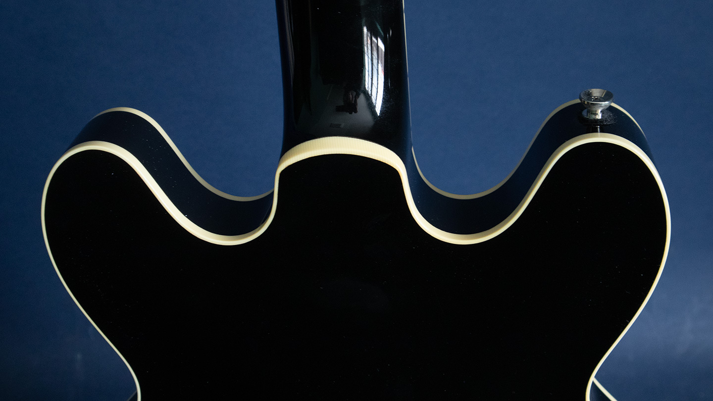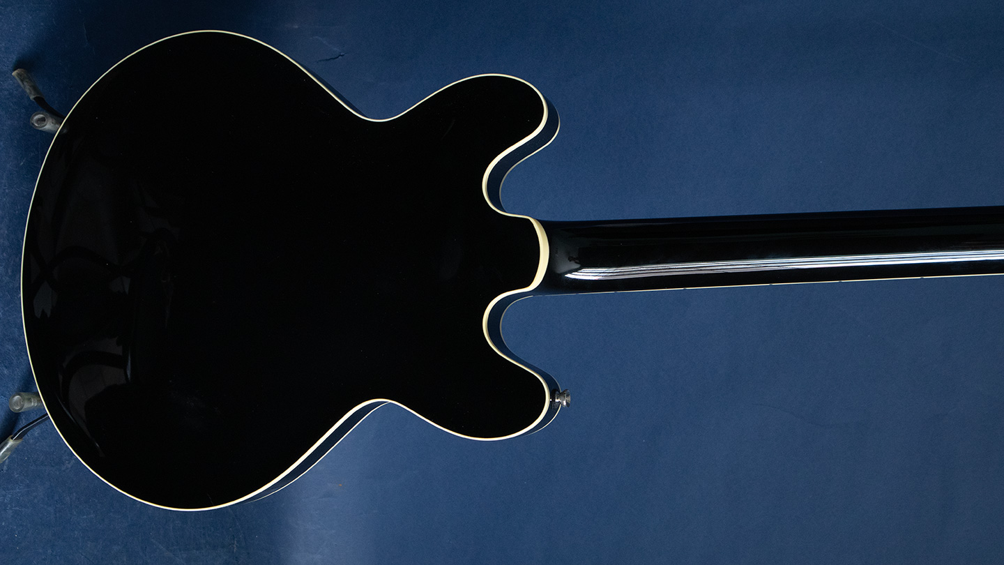 Jet Black, in excellent condition, the deluxe version has grained ivoroid binding on the body, fretboard, truss rod cover and headstock. They also have custom made ivoroid knobs, tuner buttons and pickup rings. Deluxe indeed. Plus this one has the amazing looking optional double parallelogram inlays.