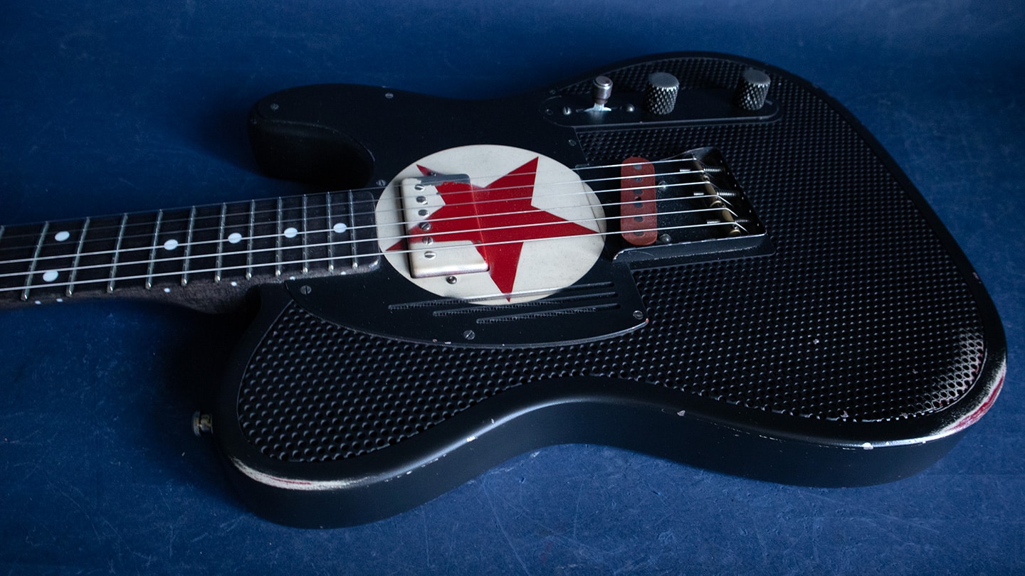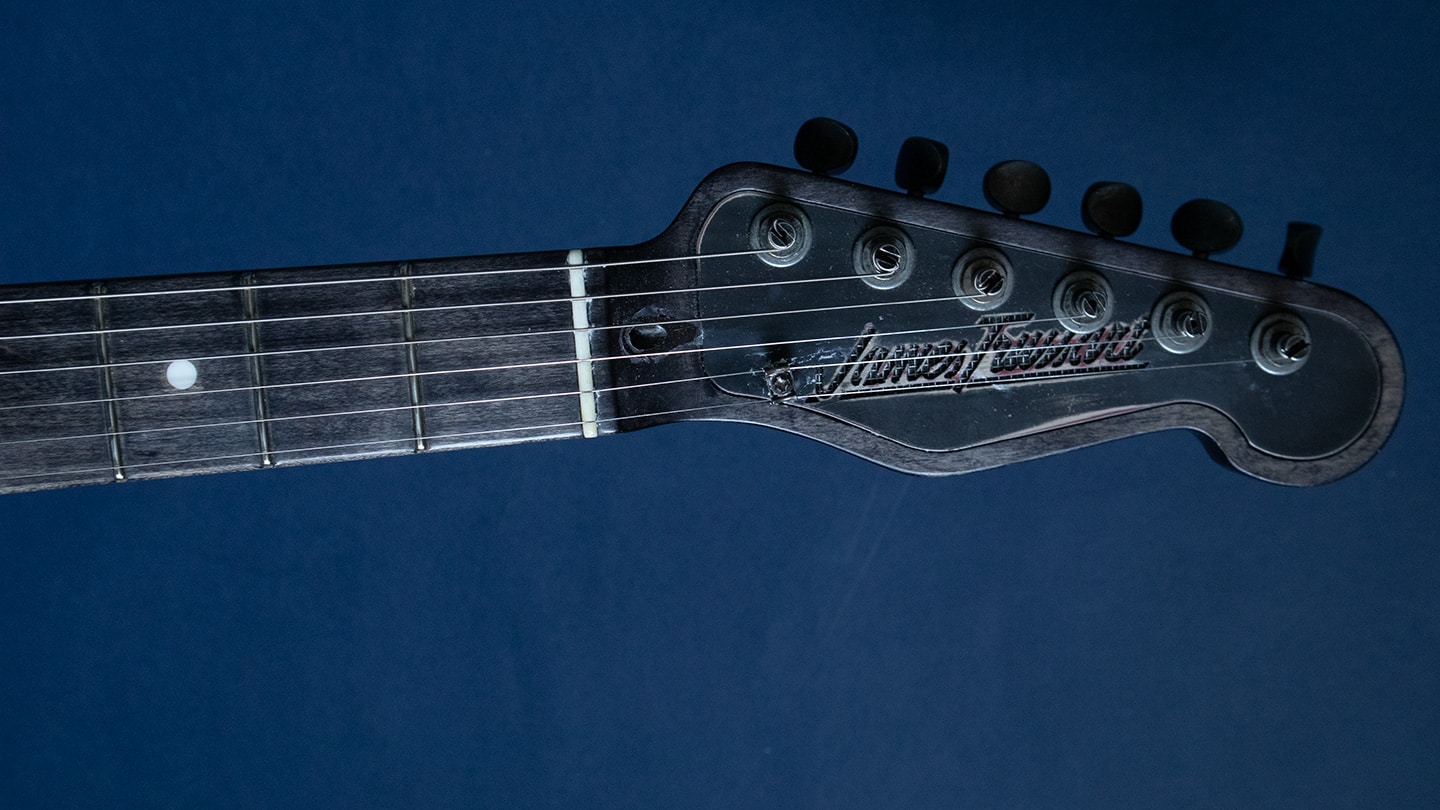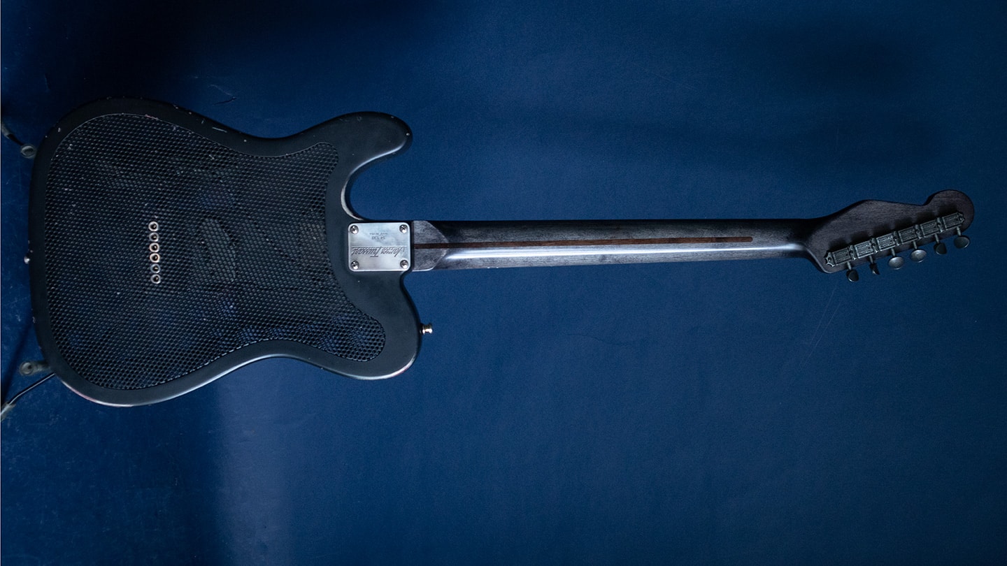 Black, hollowbody steel body Tele, with a grey stained maple neck and fingerboard. Arcane pickups with an aluminum neck. Loaded with unique details these are really works or art. Has a 25.5” scale, 1 5/8” nut, 9” radius and 6105 frets. Has Tone Pros Kluson style tuners. These are American made and have a unique tone and look. The pickups aren’t glassy, these pickups speak with authority. A medium to large round C shape maple neck that feels wamr and has rounded edges and nice 6105 frets for bends that never end. Comes with the original deluxe hard case. Each guitar is unique.