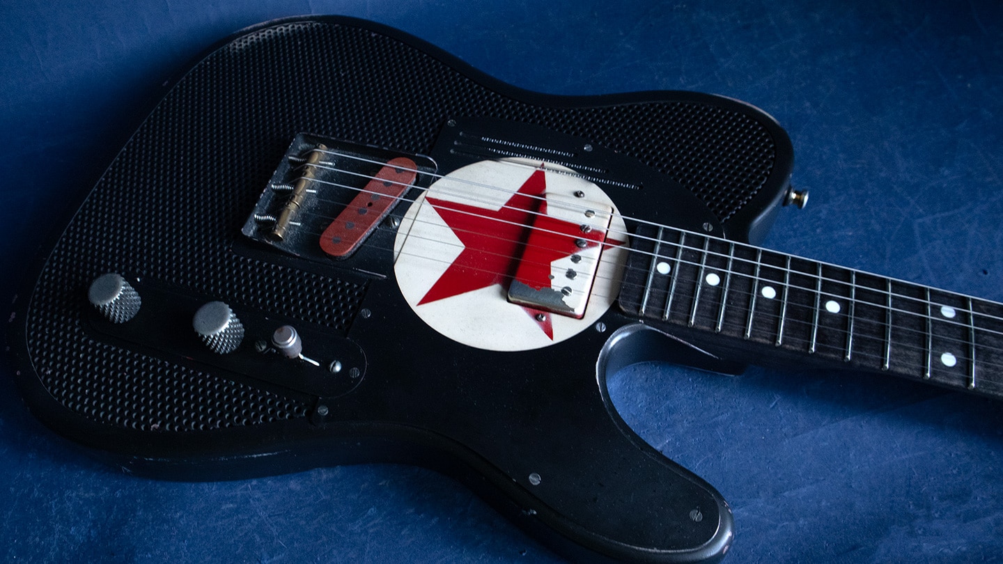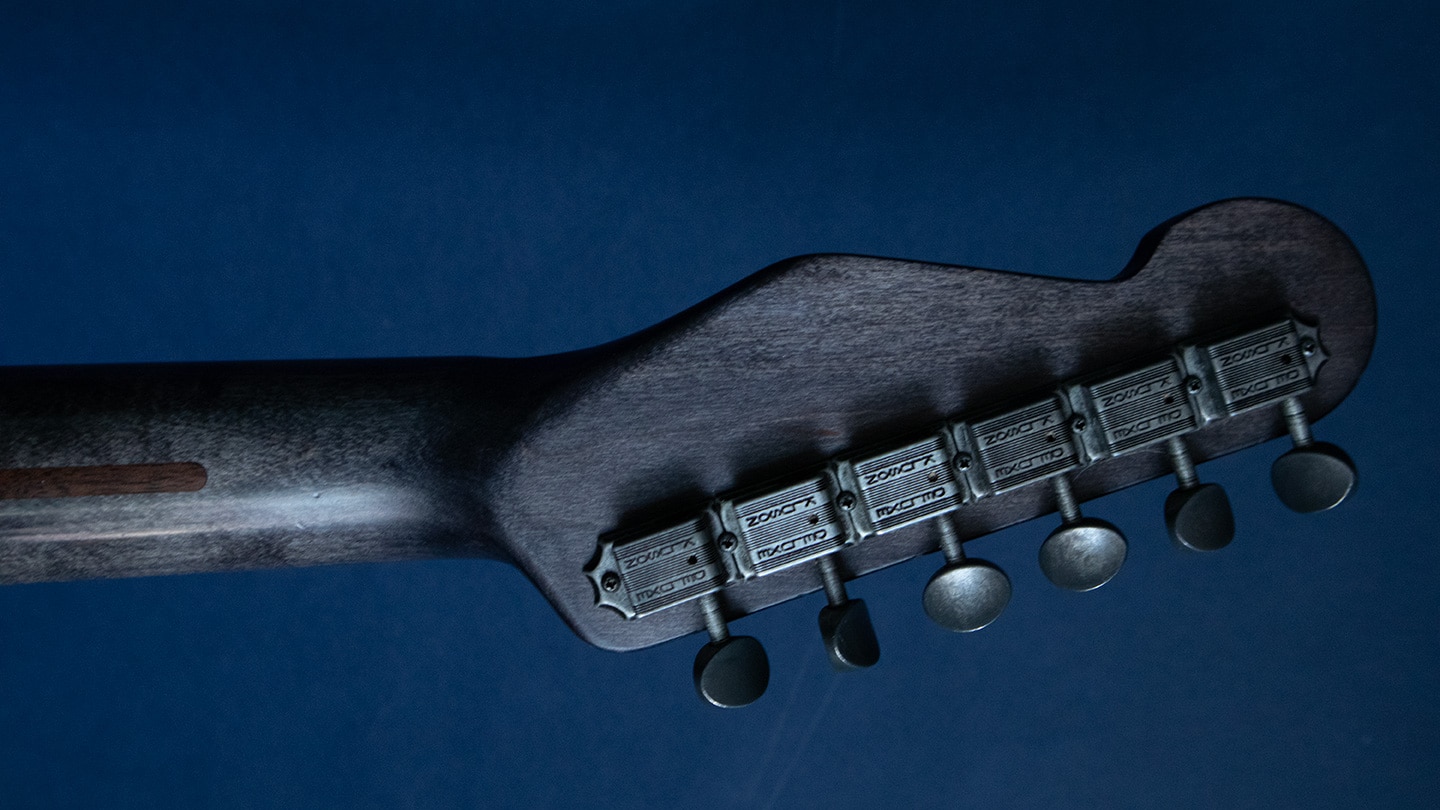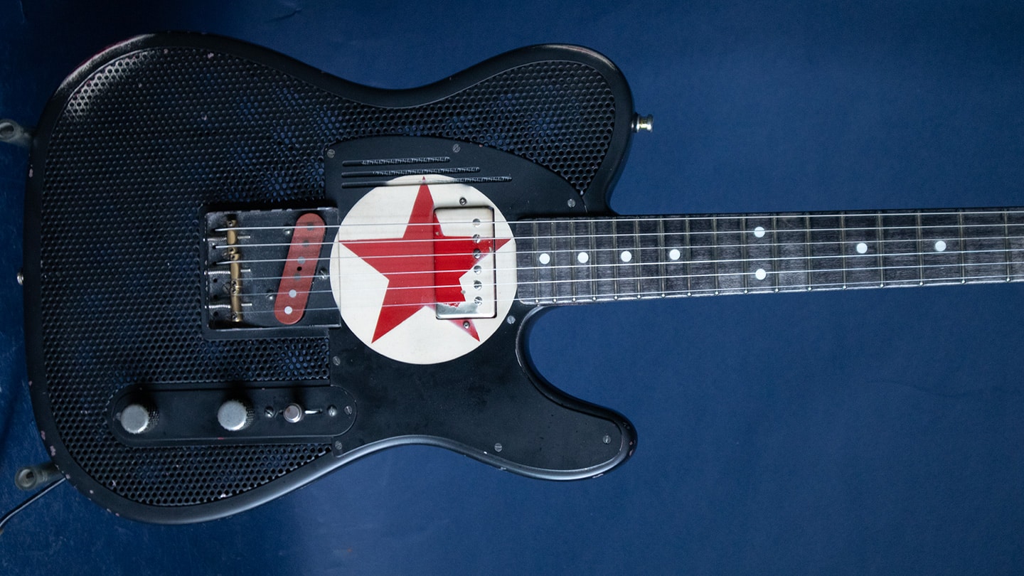 Black, hollowbody steel body Tele, with a grey stained maple neck and fingerboard. Arcane pickups with an aluminum neck. Loaded with unique details these are really works or art. Has a 25.5” scale, 1 5/8” nut, 9” radius and 6105 frets. Has Tone Pros Kluson style tuners. These are American made and have a unique tone and look. The pickups aren’t glassy, these pickups speak with authority. A medium to large round C shape maple neck that feels wamr and has rounded edges and nice 6105 frets for bends that never end. Comes with the original deluxe hard case. Each guitar is unique.