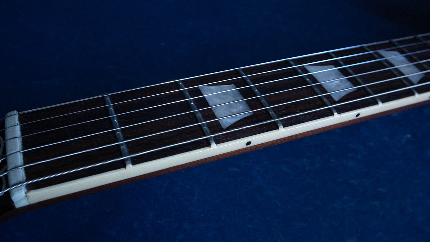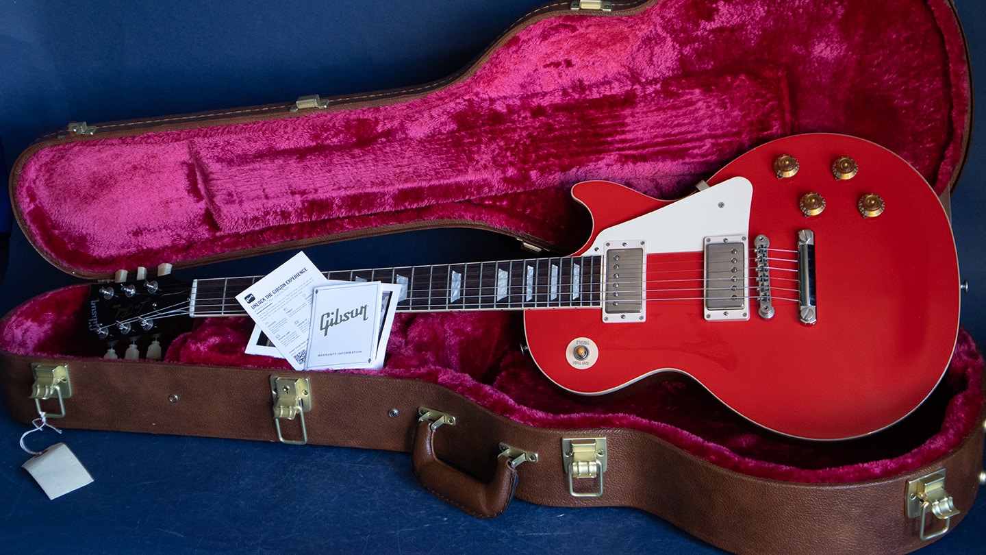 Cardinal Red, a great looking used Les Paul Standard, a couple of pick scratches on the top but that’s about it. Bound rosewood fretboard shows no fret wear, 50’s neck profile, weighs in at 9.5 pounds. Comes with the original pack list and bench photo in the original hard case.