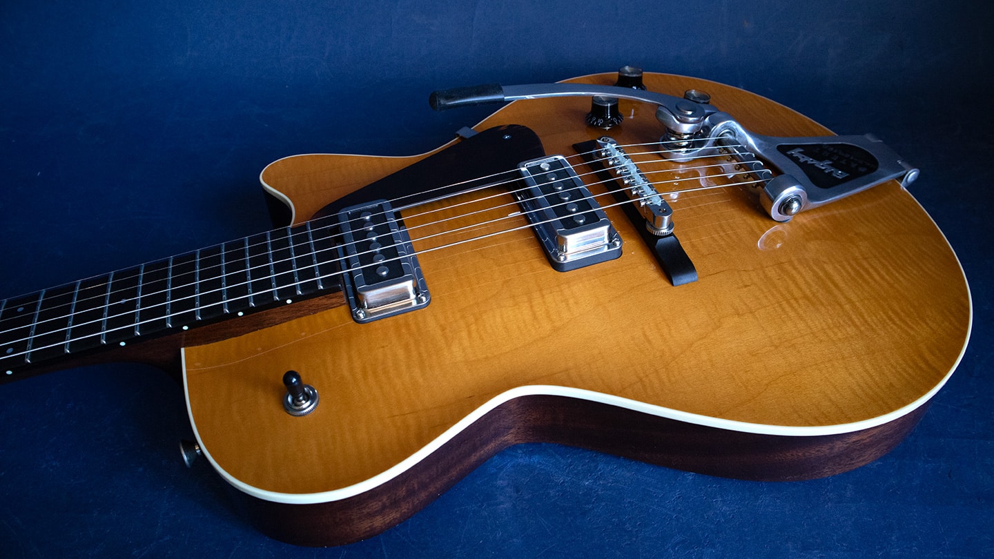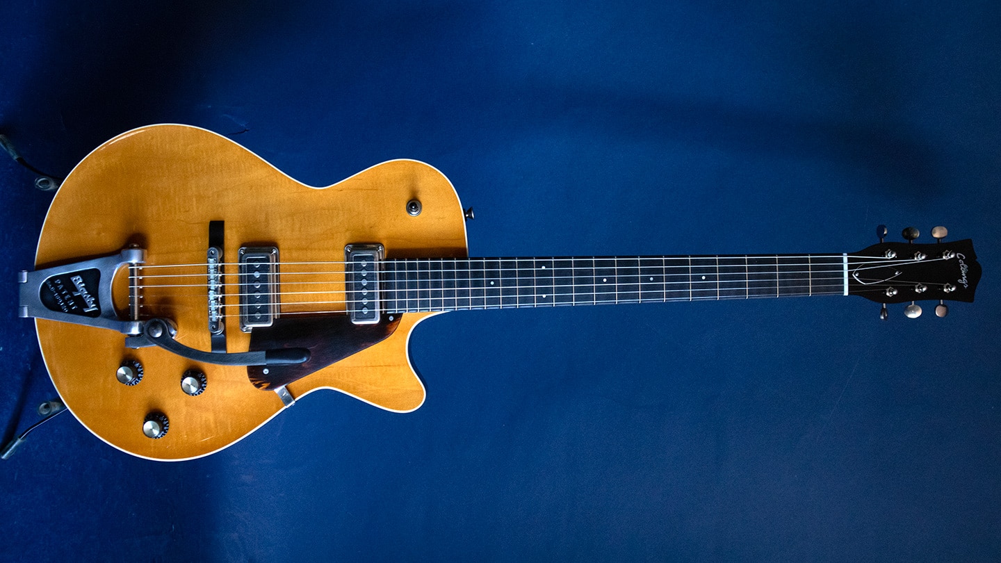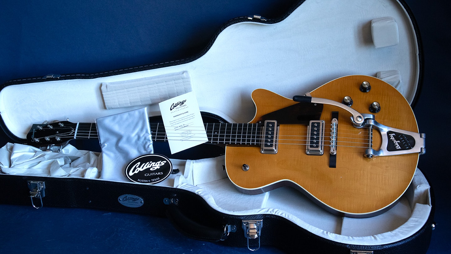 Antiqued Blonde finish. Designed after exhaustive collaboration between Julian Lage and the super-focused Collings electric team. Custom laminated maple top over mahogany back and sides. Trestle-braced to eliminate feedback yet enhancing acoustic properties. These guitars have no options but are the number-one selling guitar in Collings’ impressive electric lineup. The Ron Ellis pickups astounded our ears. Clear, articulate bass and the “rifle click” snap that makes every note stand out even under high distortion. Magnificent. Why buy a vintage Gretsch Duo Jet and worry about it falling apart? Listen to Julian play one of these. You need one. With deluxe factory hard case, made in Austin, Texas, USA. #25687