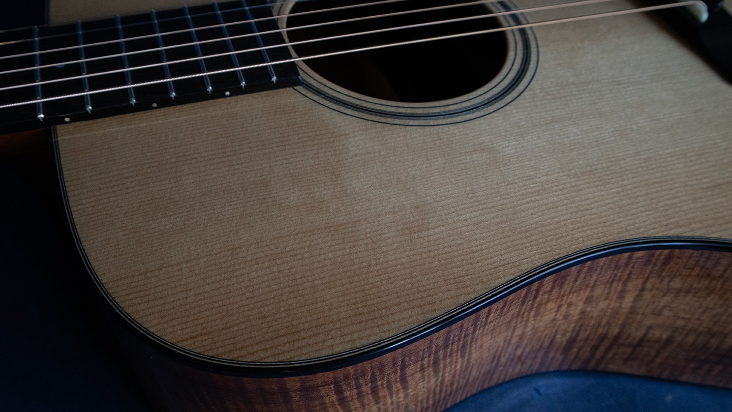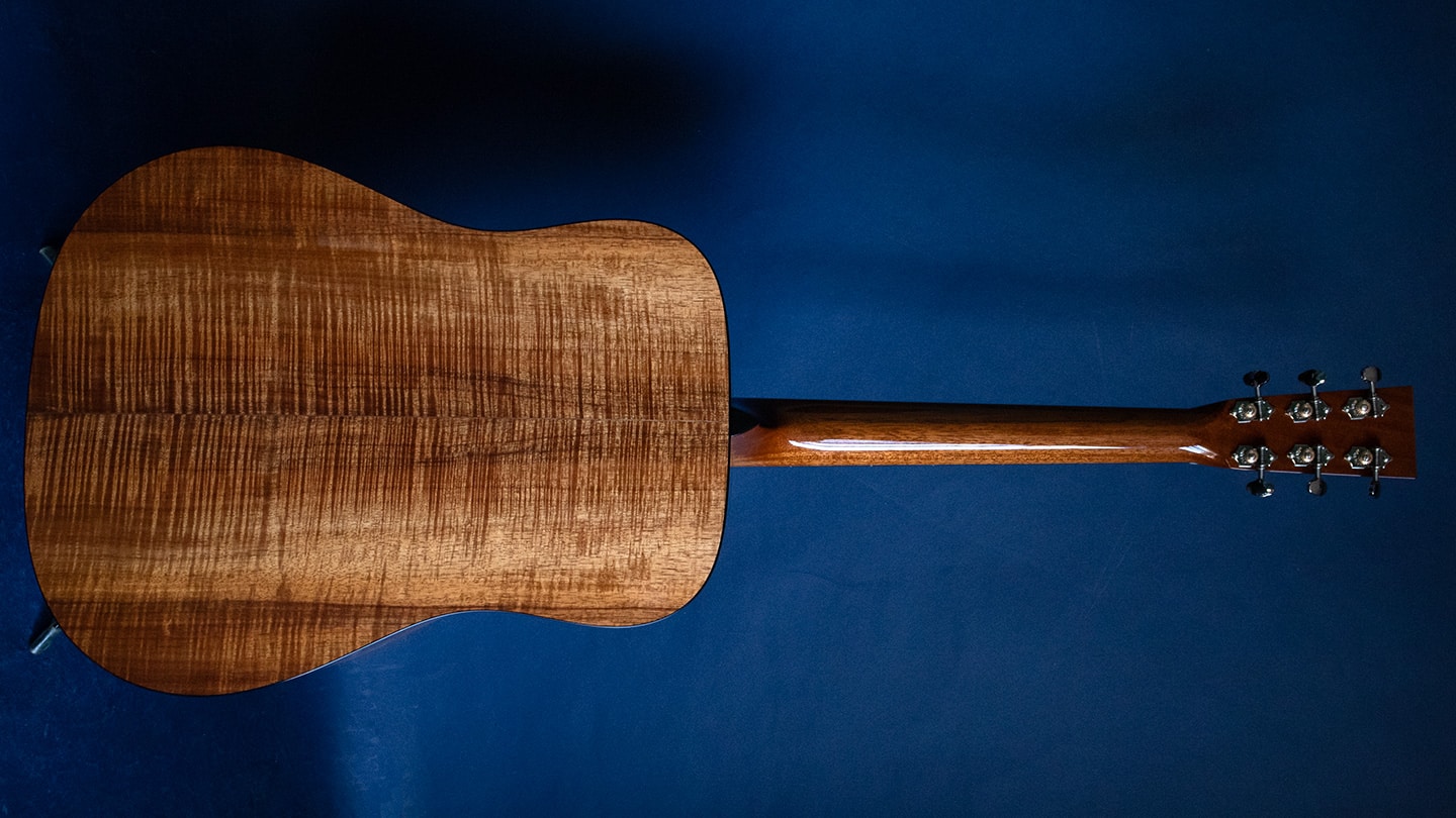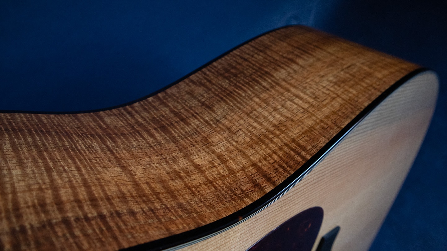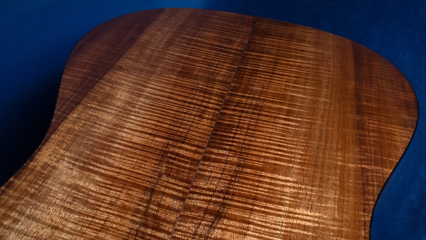 Natural, with old growth Sitka top. We’ve waited almost two years for this and…wow! Stunning bookmatched high grade flamed koa and an Old Growth Sitka top. From ancient slow growing trees often hundreds of years old. A highly valued tone wood. Look at the top, it’s very cool looking.