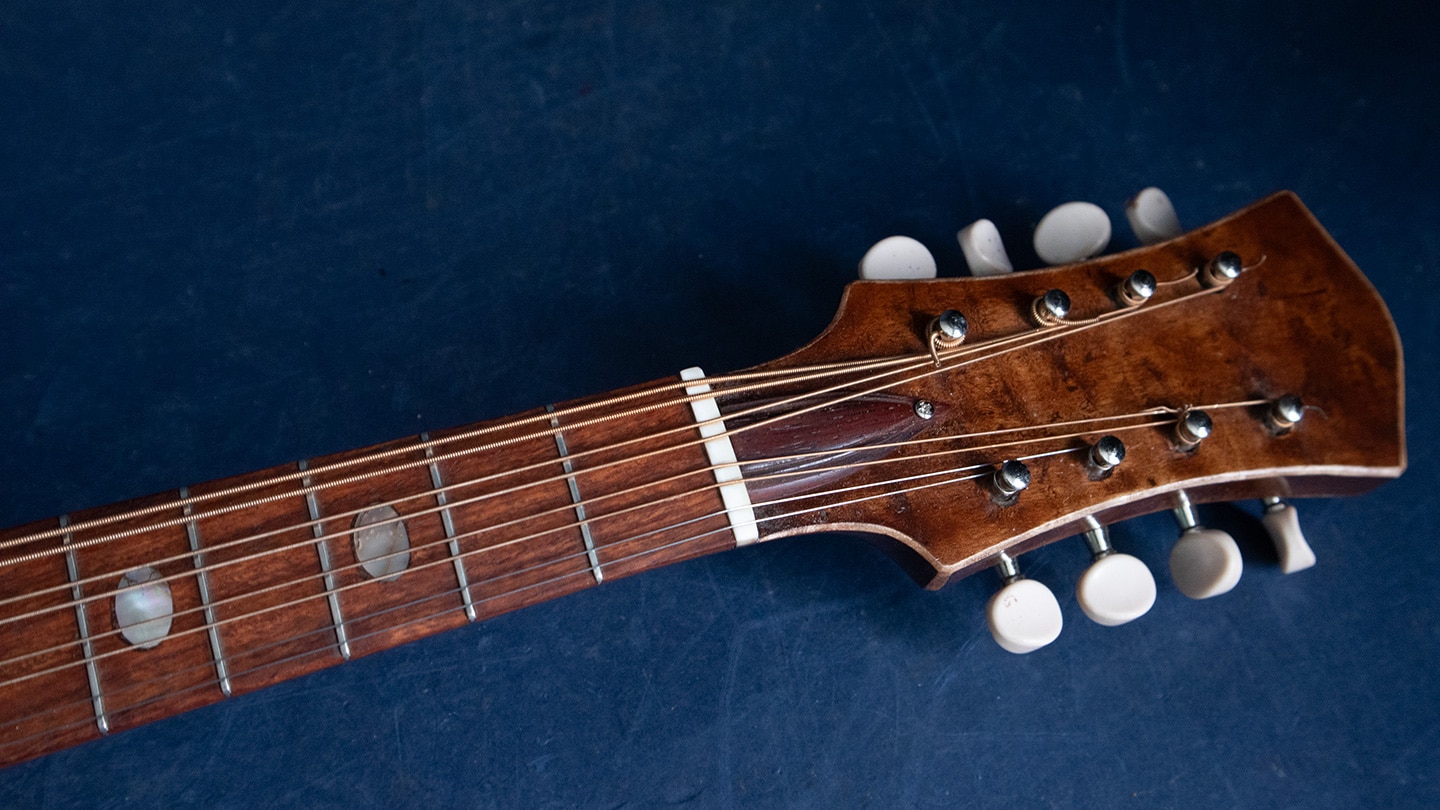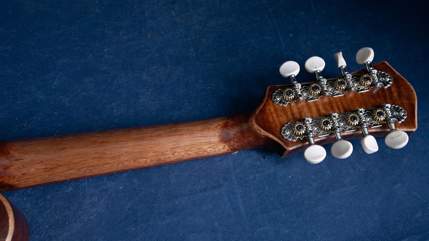 Natural, Spruce top, flamed maple back and sides, May we please guide your ear to that hand carved and tap tuned top and back. The top is an octave away from the back and the tone is “Le Magnifque”. Yes he hand carved the top, tailpiece, bridge and the MOP inlay without power tools. Each Finn is unique, no two are alike, perfectly imperfect. See the video on Finn on our social media. Sorry, no case.