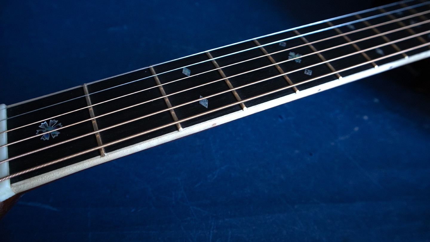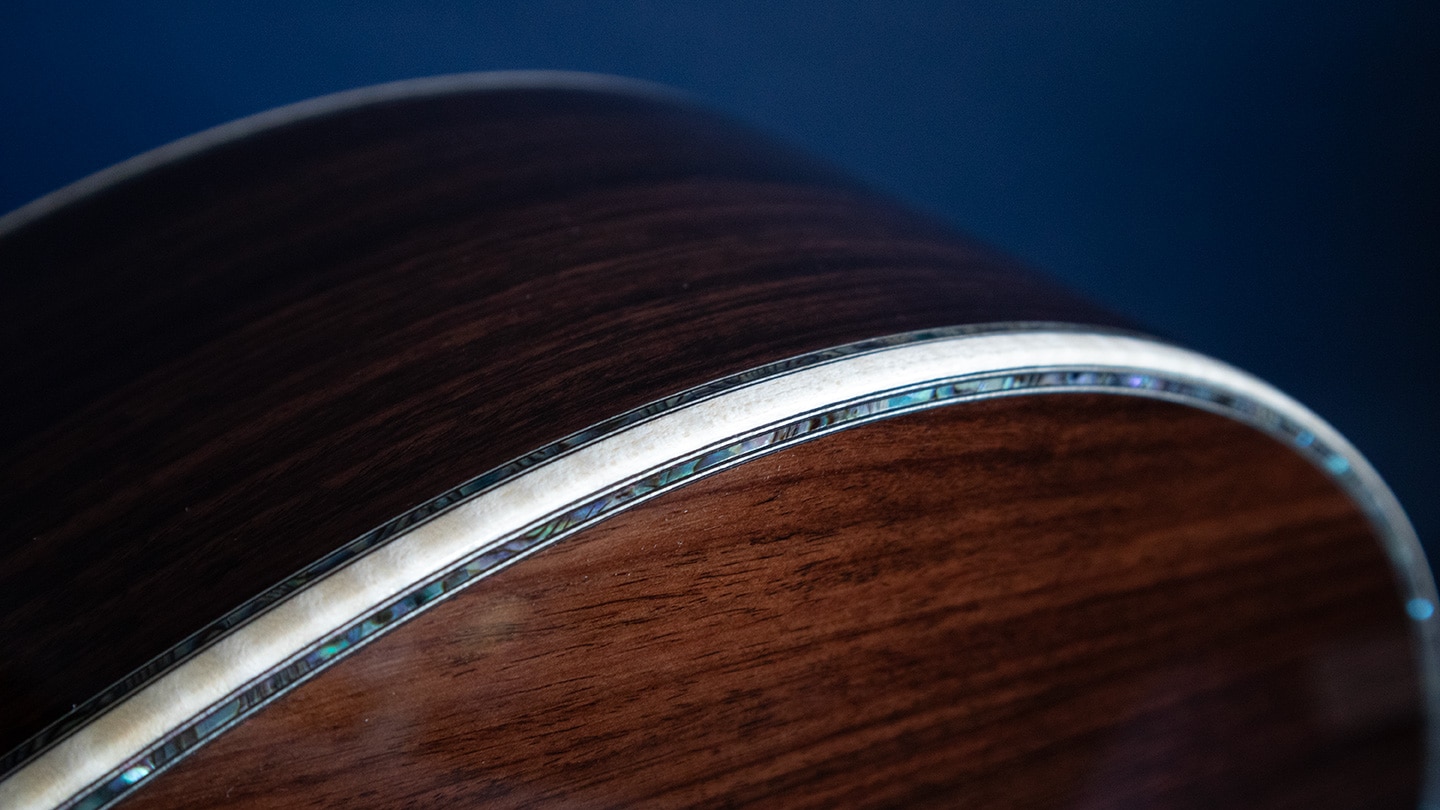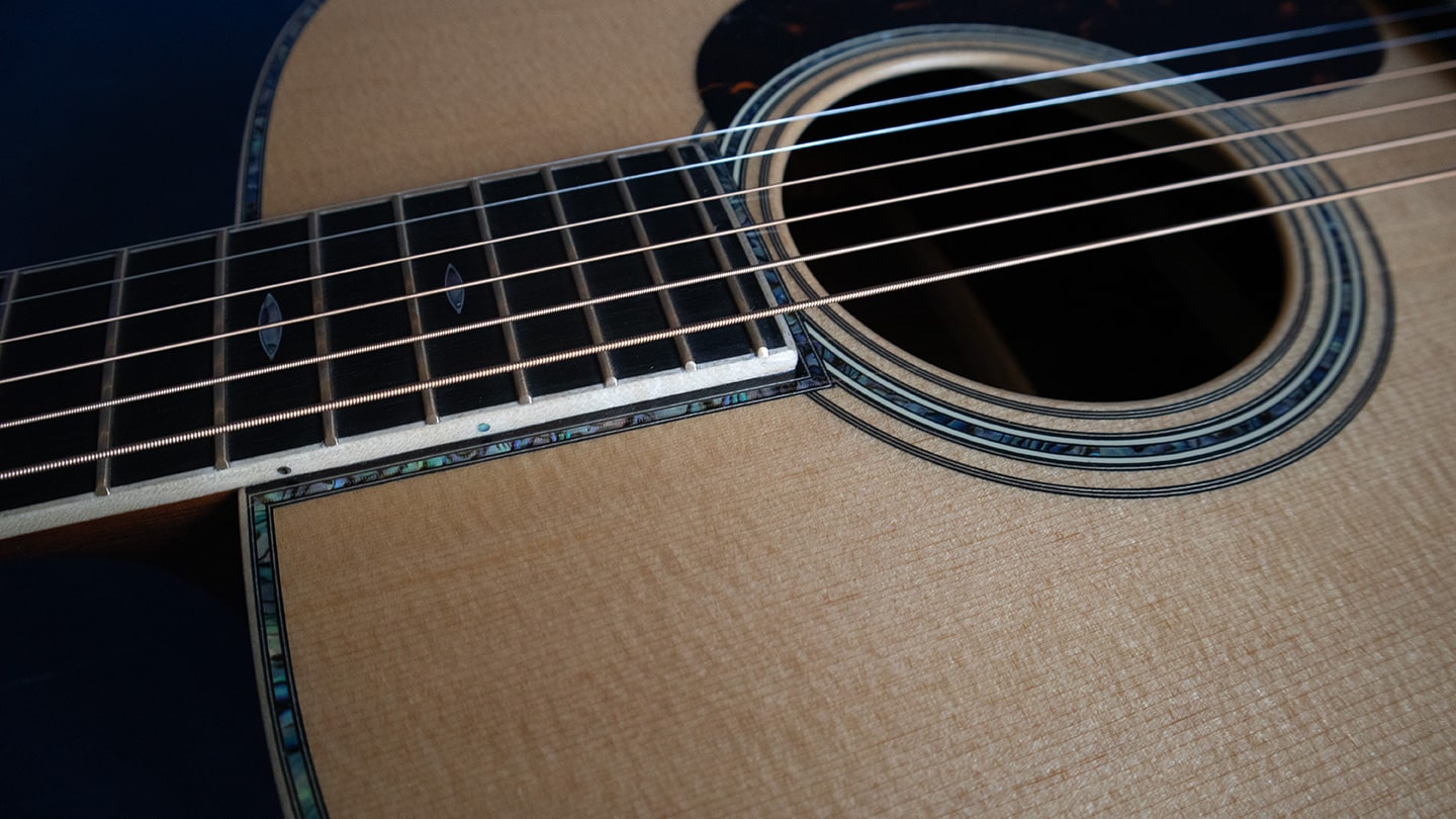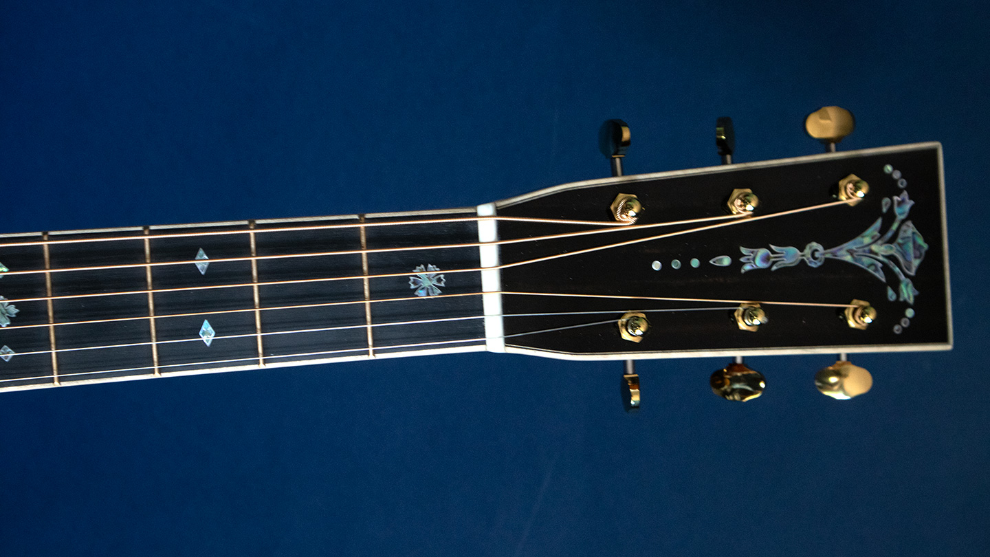 The Vintage Deluxe neck profile with 1 3/4″ nut and high-performance taper delivers a smooth, modern feel. Luxury details include European flamed maple binding, abalone pearl trim and inlays, ornate abalone torch headstock inlay, gold frets, and gold open-gear tuners. Modern touches like a carbon fiber bridge plate and gold Liquidmetal bridge pins push tone and sustain even more.